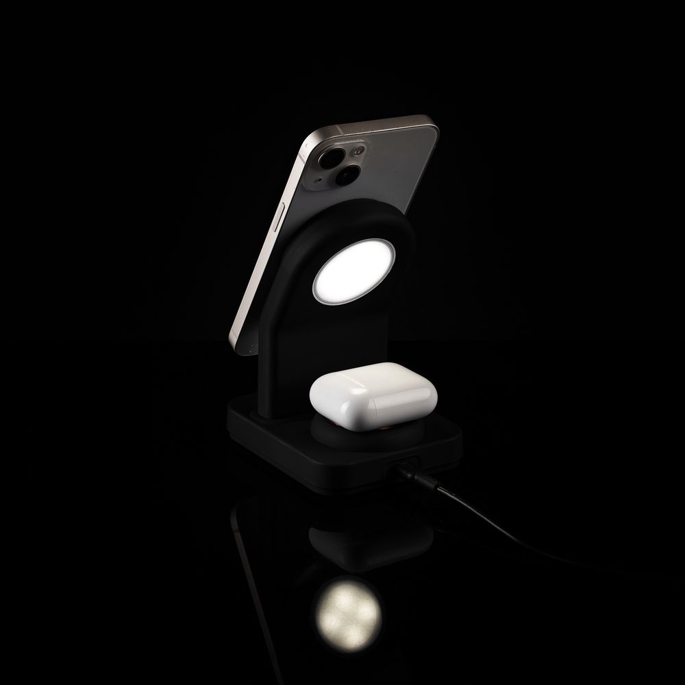iPhone 12–15 c магнитами MagSafe могут удерживаться на основной области станции. Ранние или компактные модели iPhone или смартфоны с диагональю 5,7–6" на OS Android можно оснастить специальным адаптером Magmate или чехлом со встроенным кольцевым магнитом сзади.