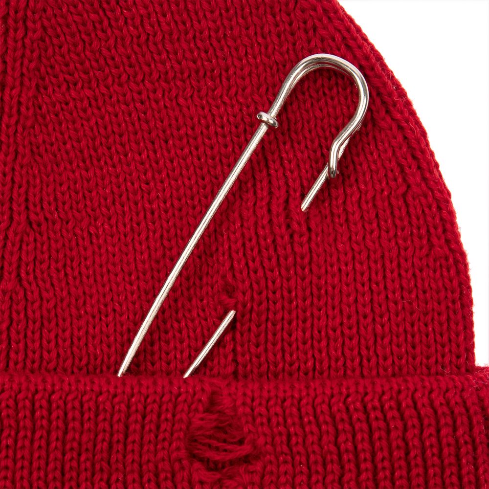 Однослойная шапка бини с рваным отворотом и металлическими аксессуарами для дерзких образов в любом возрасте. Яркий и запоминающийся акцент в стиле гранж.