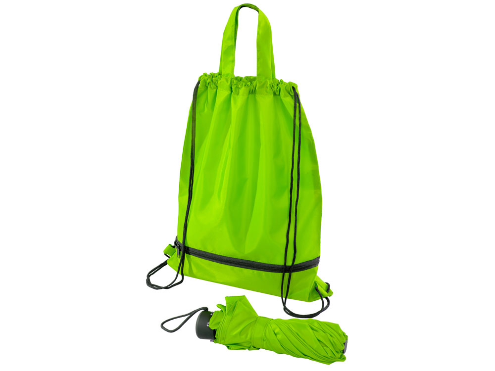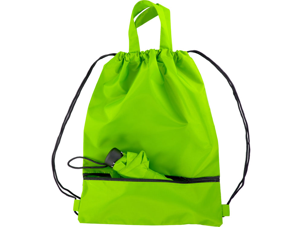 Механический зонт с прорезиненной ручкой идет в комплекте с сумочкой для покупок. На дне сумочки предусмотрен карман на молнии, в котором вы можете хранить зонт дома или прятать в него мокрый зонт, когда вы попали под дождь. Находясь в кармане сумочки, мокрый зонт не доставит неудобств. Сумочка имеет 2 варианта использования: шопер с двумя 2 ручками и рюкзак-мешок со шнурками. -