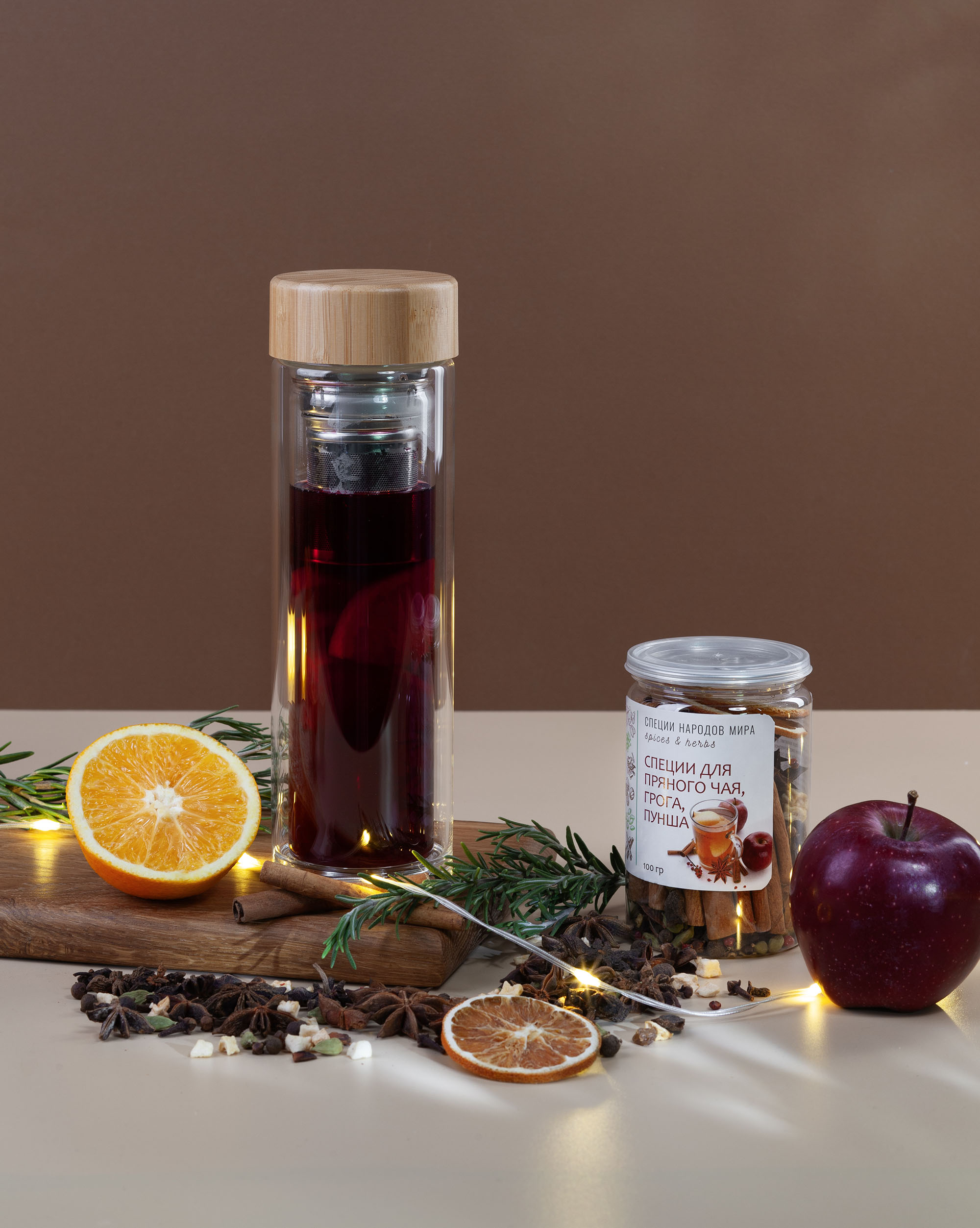 специи для глинтвейна, пряного чая, пунша, грога 100 гр (3 порции: палочки корицы, бадьян, гвоздика, кардамон, изюм, яблоки сушеные, перец душистый, апельсины сушеные кольцами, перец розовый); h 11 х d 7 см;