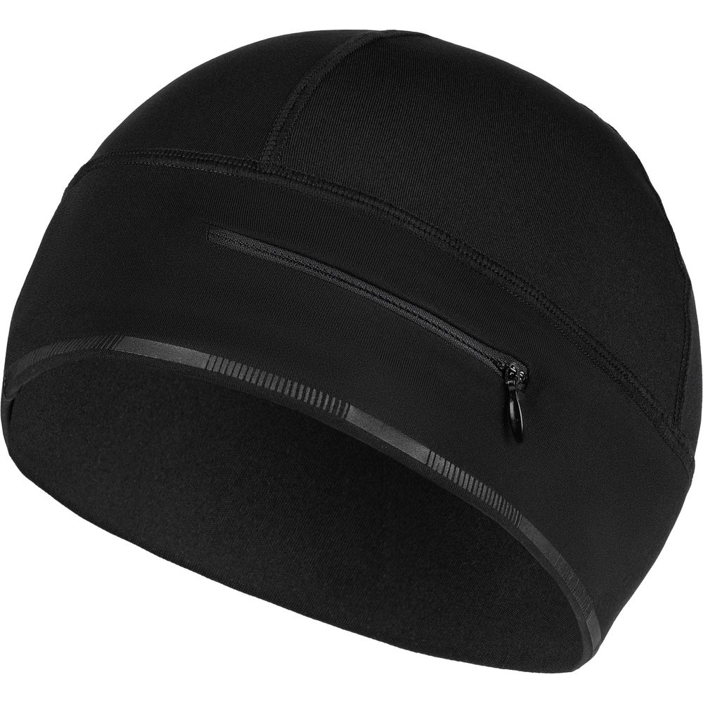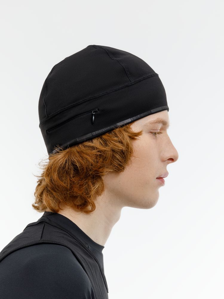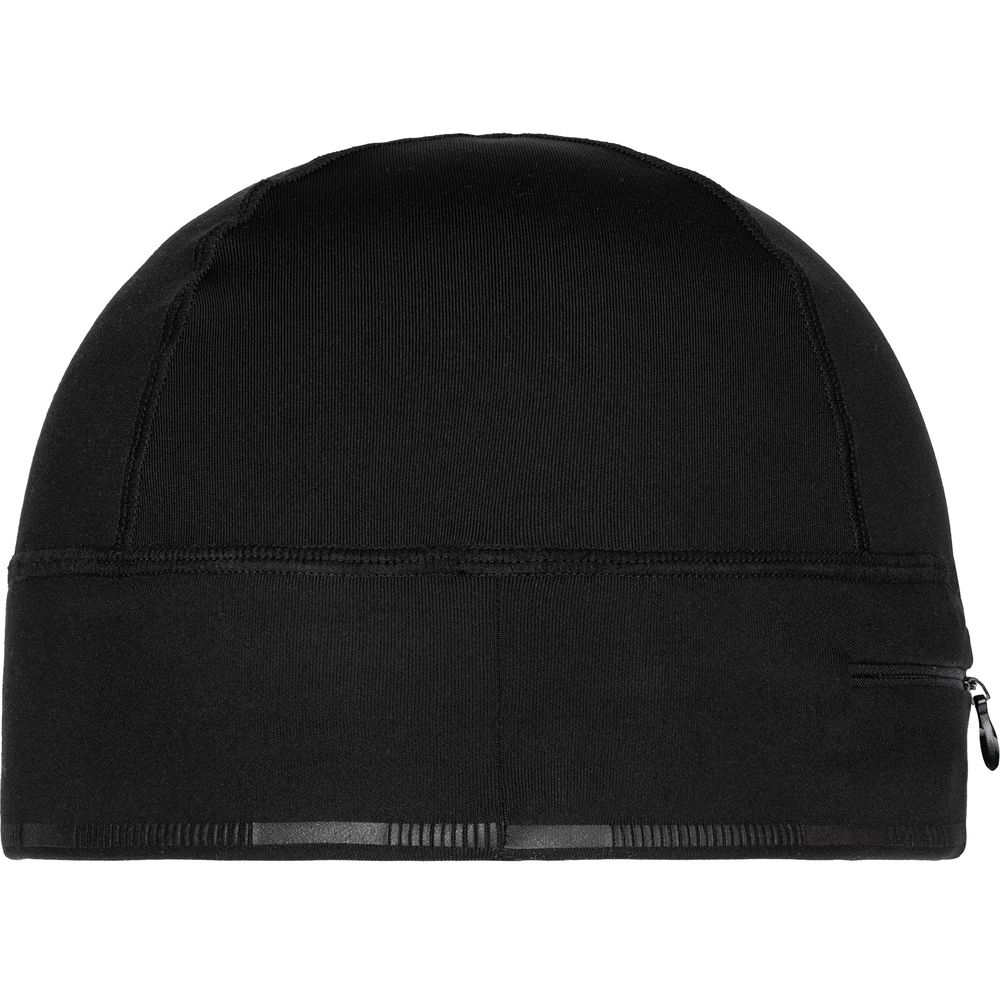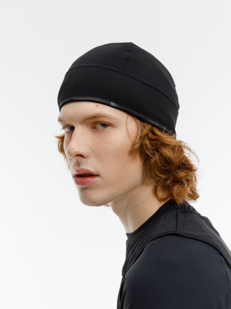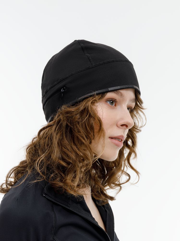 Шапка выполнена в черном цвете, но имеет светоотражающую полосу вдоль края, что улучшает видимость спортсмена в условиях плохой освещенности.