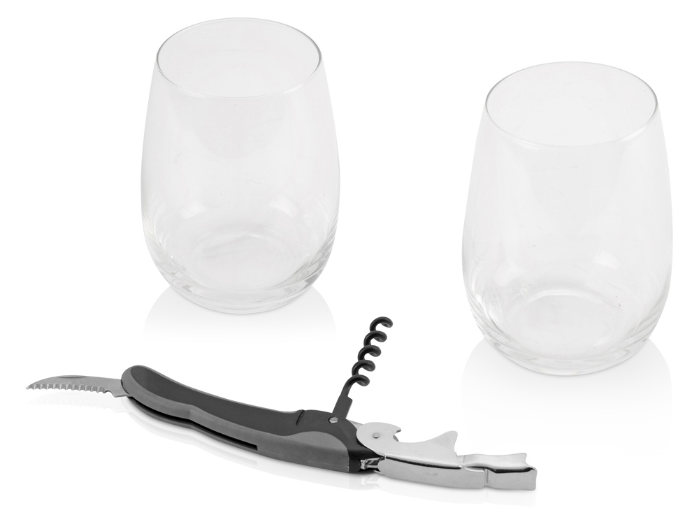 Набор состоит из двух стеклянных бокалов на 445 мл и открывалки-штопора. При желании на бокалы можно нанести логотип организации с помощью тампопечати. Отличный подарок для постоянных клиентов и деловых партнеров. -
