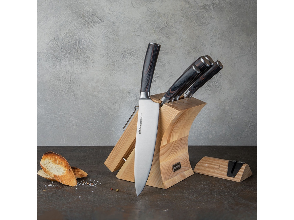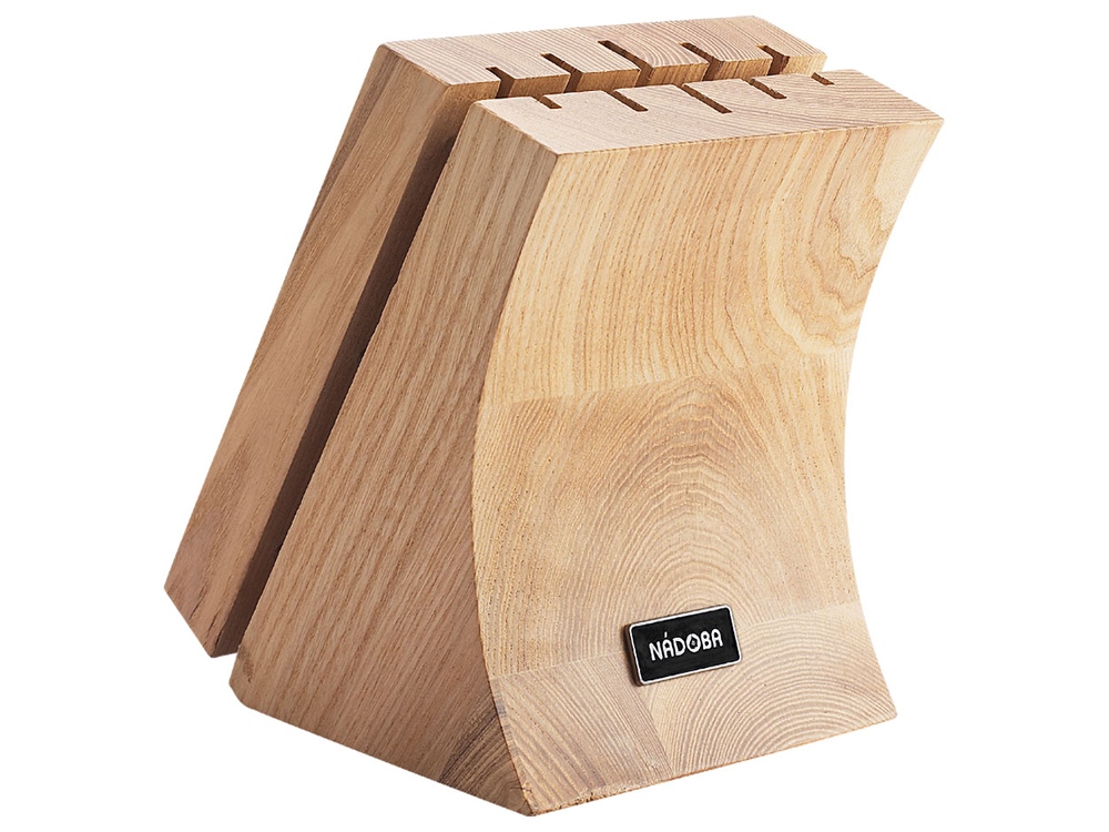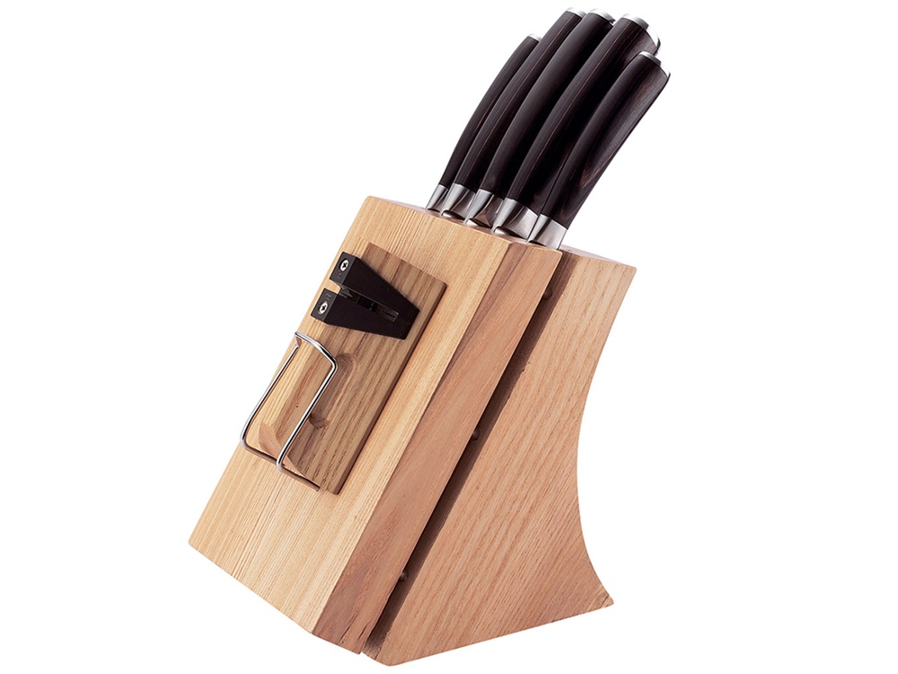 - Блок набора ножей, входящего в серию, изготовлен из натурального благородного дерева (ясень) и оснащён встроенной ножеточкой.
