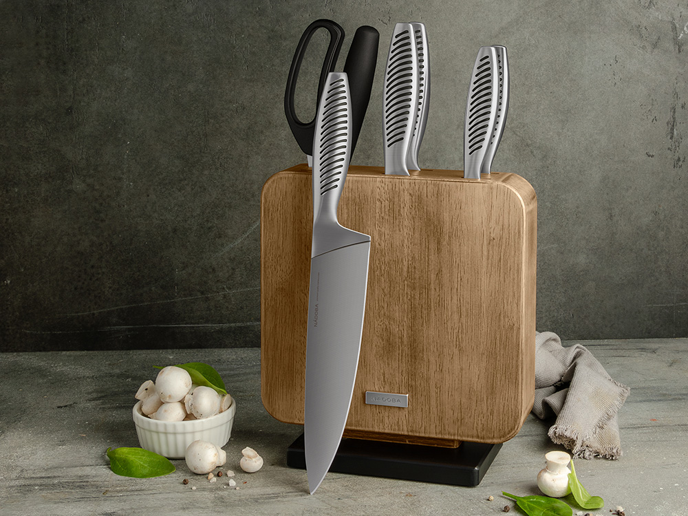 ножи: нержавеющая сталь премиум-класса, блок: натуральное дерево (гевея)
