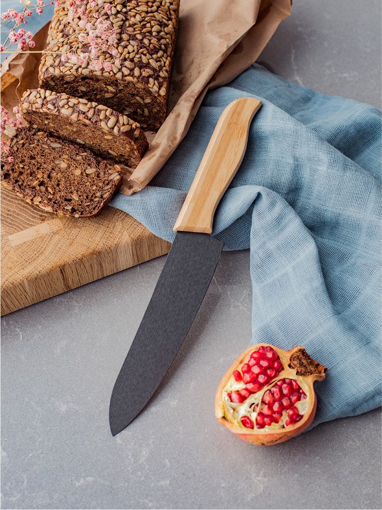 Нож Selva выполнен из керамики и бамбука. Широкий клинок имеет оптимальную форму и режущую кромку, которая не нуждается в заточке. Удобная анатомическая ручка ножа надежно лежит в руке, не скользит, практически не впитывает влагу.