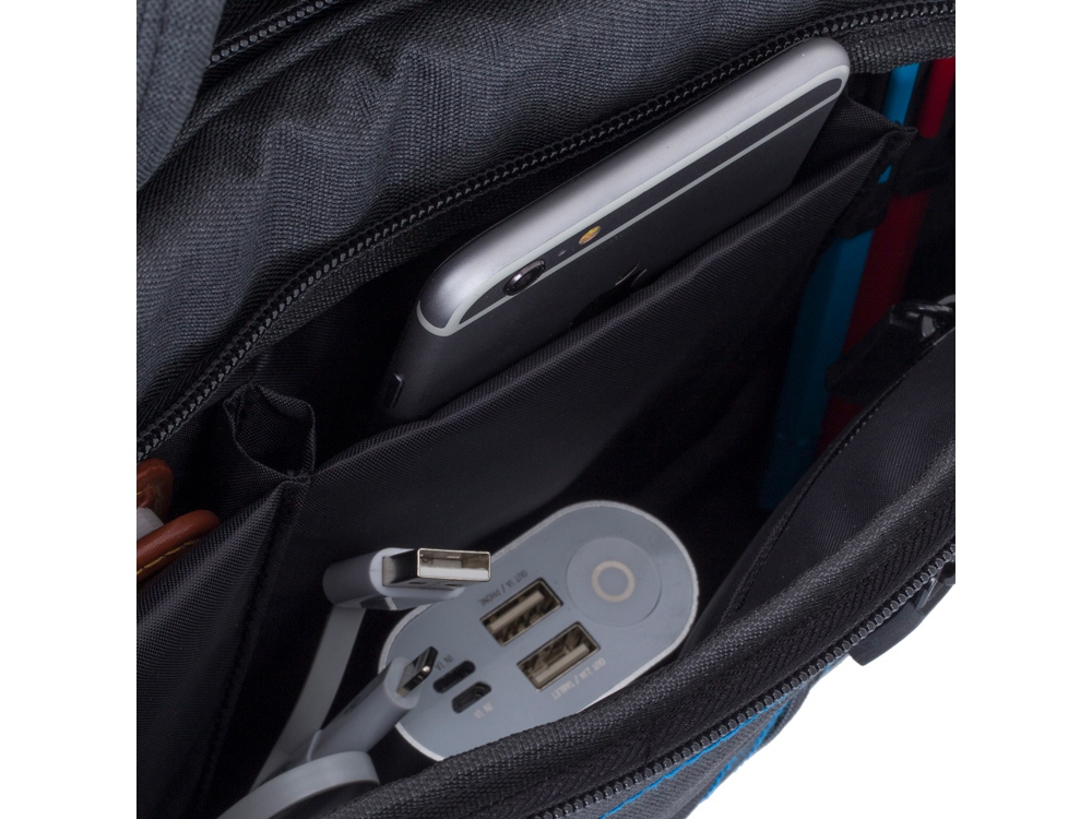 • Внешний передний карман на молнии для хранения аксессуаров, также оборудован панелью-органайзером для хранения визитных карт, флэш-накопителей, смартфона.