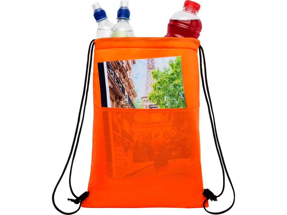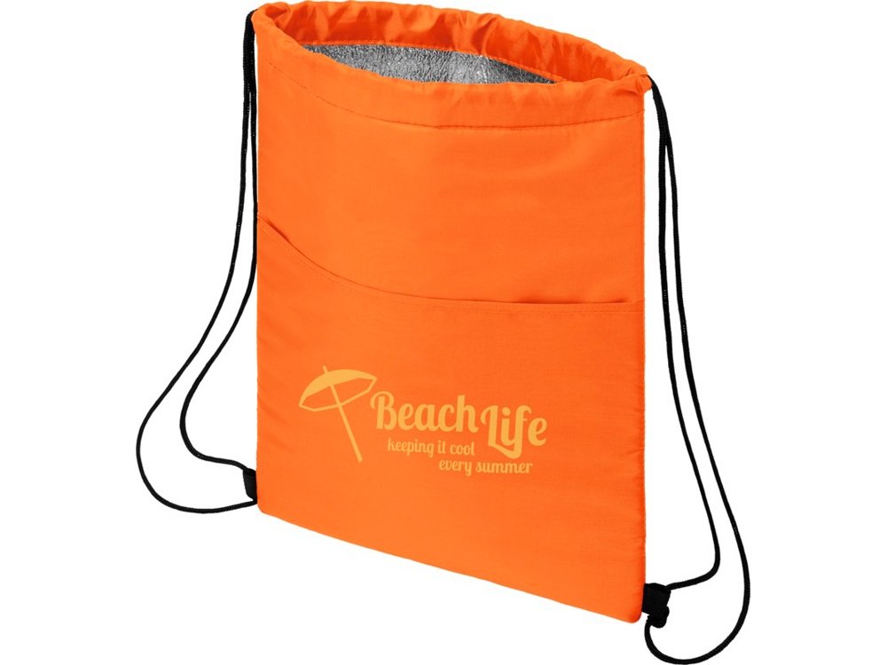 Сумка-холодильник затягивается на шнурок черного цвета. С открытым передним карманом. Вмещает 12 банок. Прочность до 5 кг. -