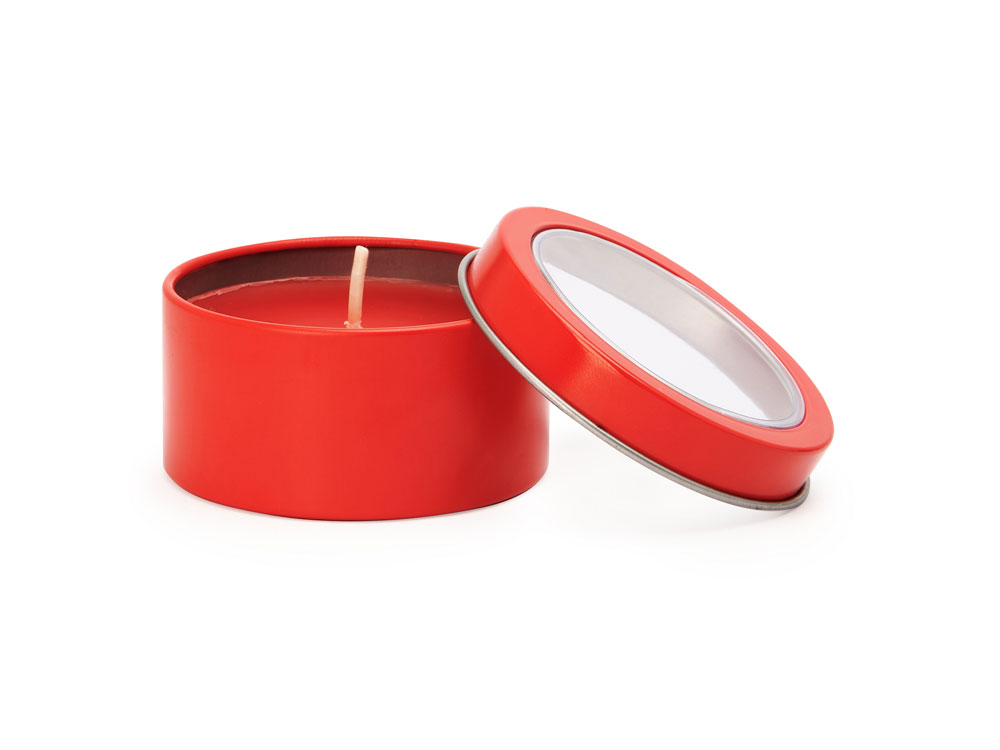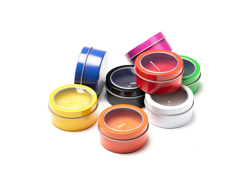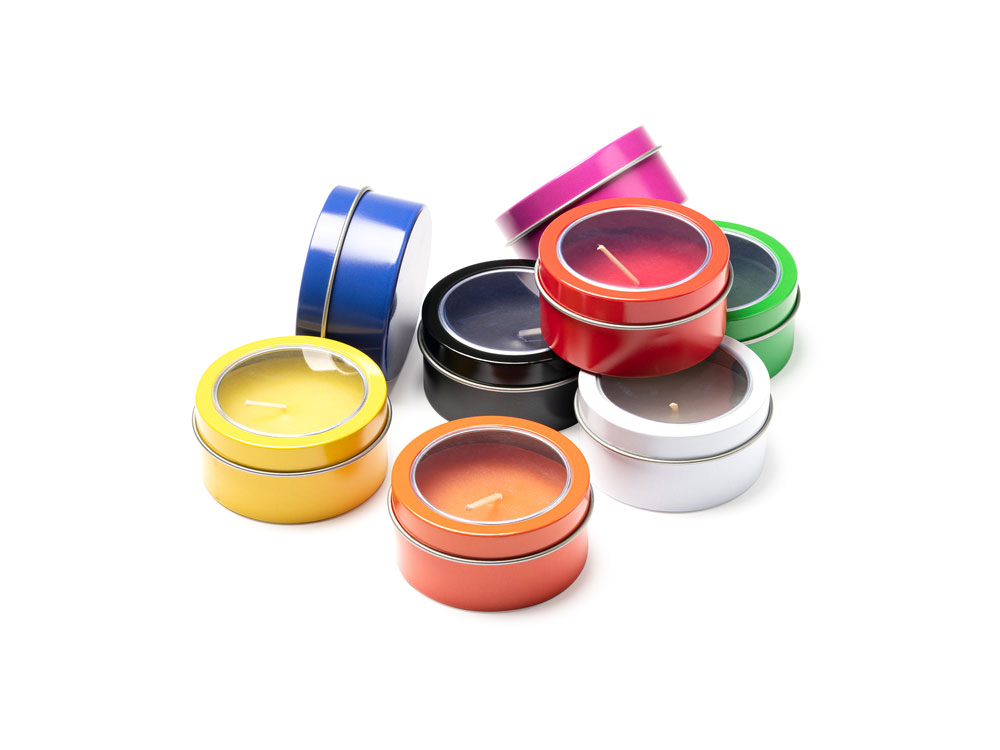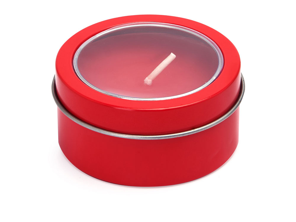 Ароматическая свеча с запахом ванили в металлическом круглом подсвечнике с крышкой с прозрачным окошком. Цвет свечи в тон подсвечника. белый фитиль