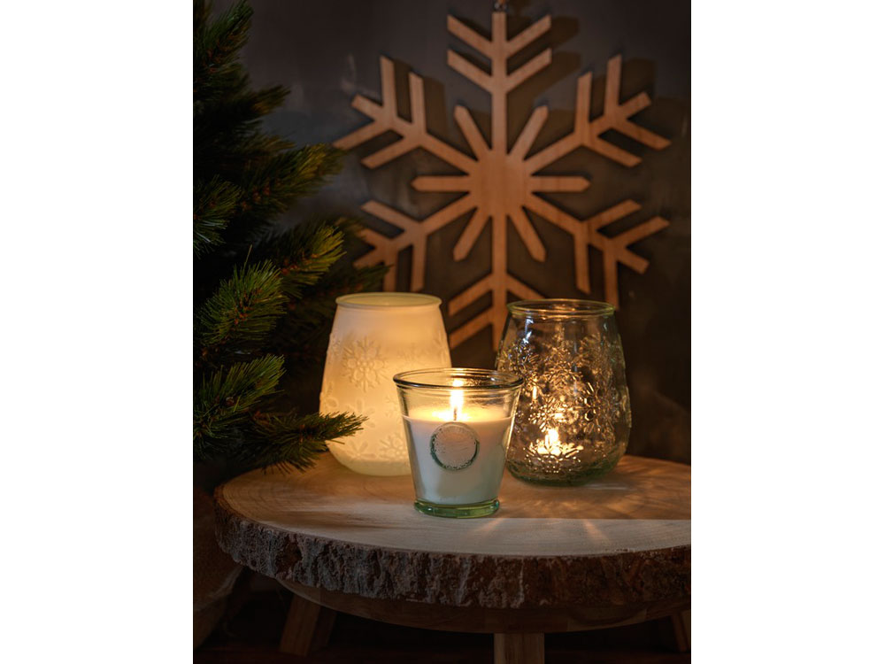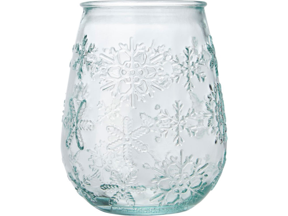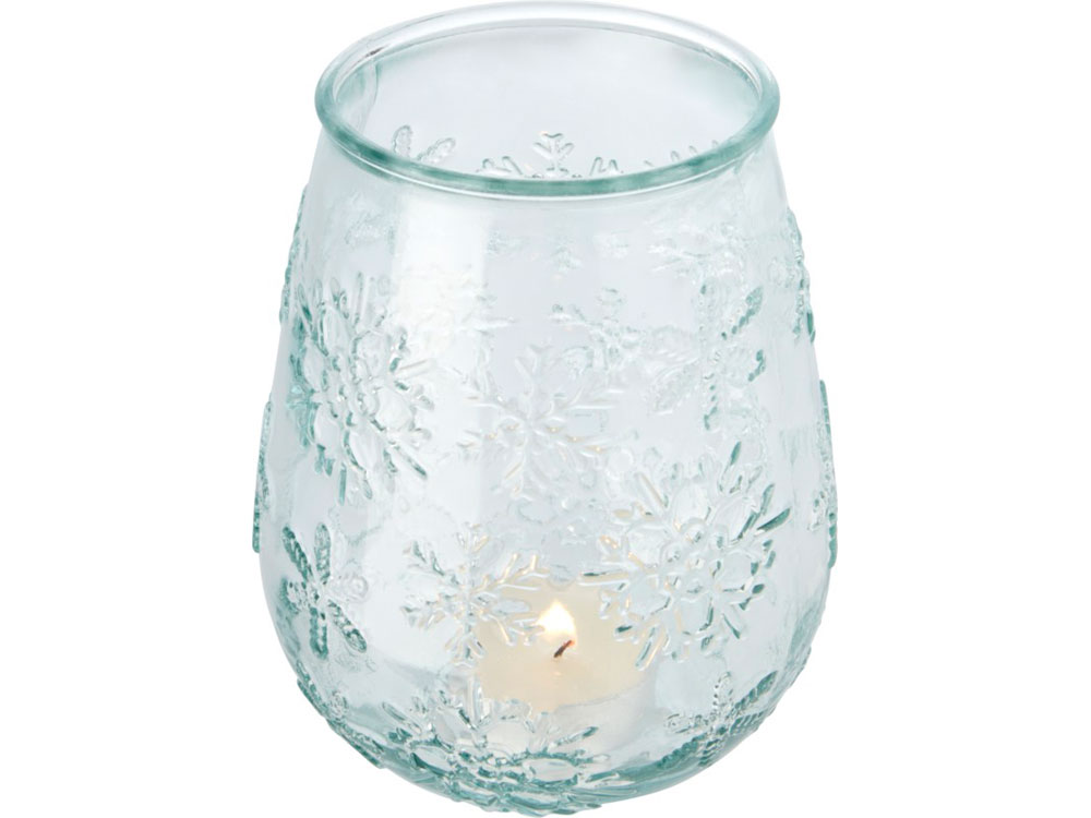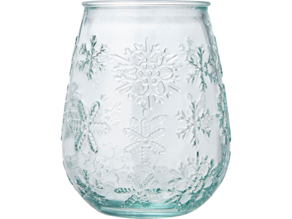 Подставка для чайной свечи из переработанного стекла с узором в виде падающих снежинок. Эта подставка создана из 1 переработанной стеклянной бутылки. Переработанное стекло не отличается ничем по качеству от обычного, но при этом является более экологичным, ведь на изготовление этого материала тратится меньше энергии, сырья и примесей. Чайная свеча не входит в комплект.