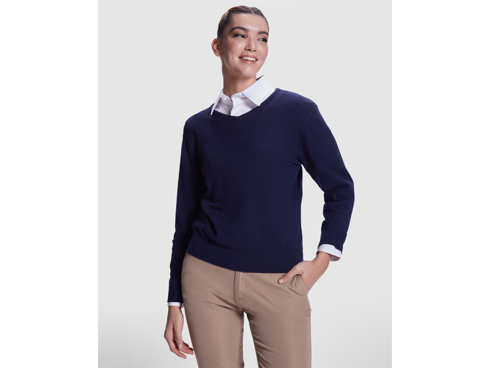Джемпер c V вырезом тонкой вязки для женщин. Отделка рибом 1х1 по горловине, низу и манжетам