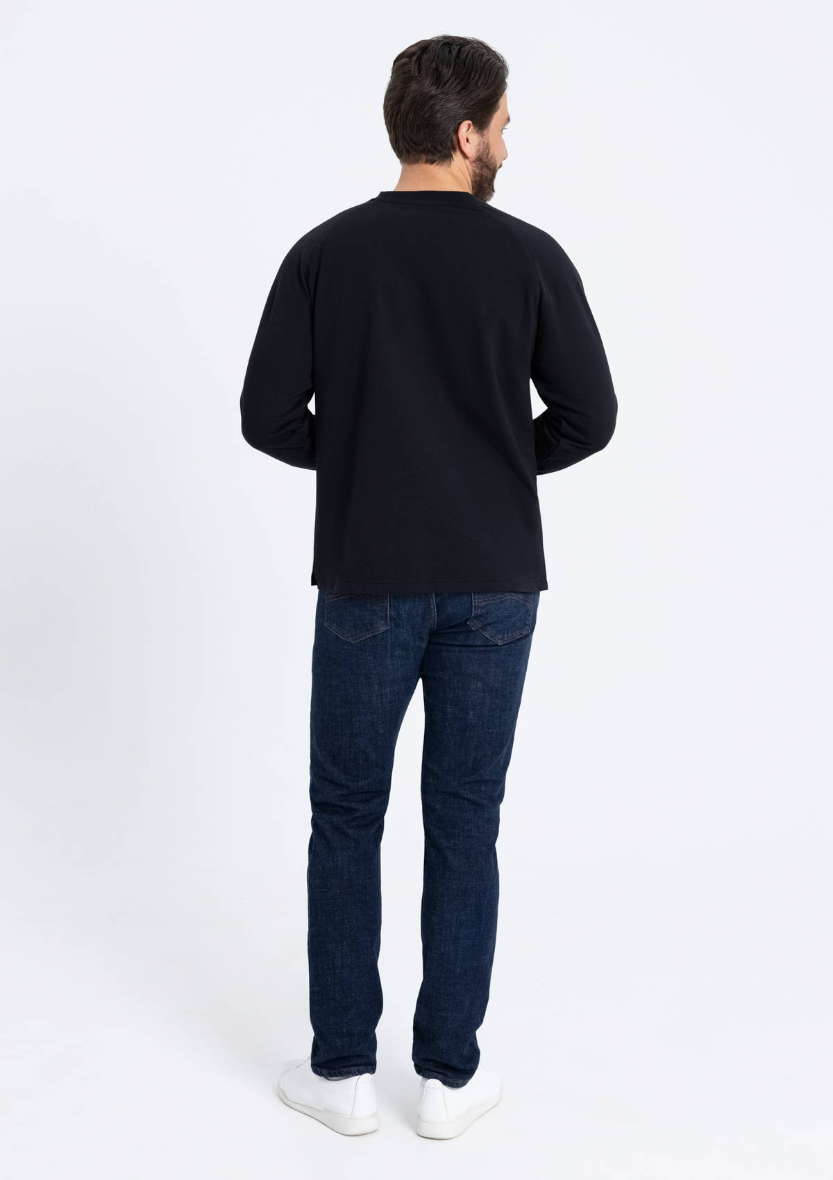 Свободный силуэт, округлый вырез, рукав-реглан и декоративные элементы, отсылающие к классическому крою. Ворот и манжет выполнены широкой эластичной резинкой.