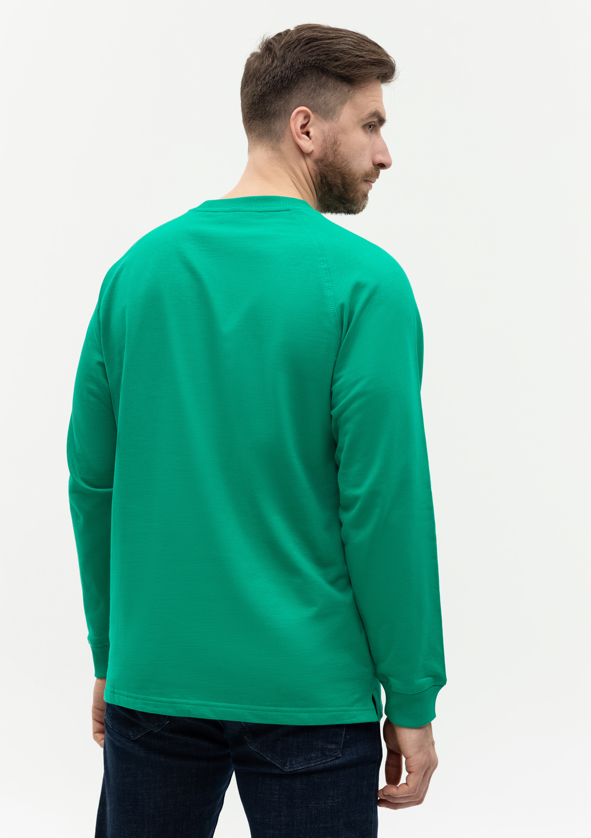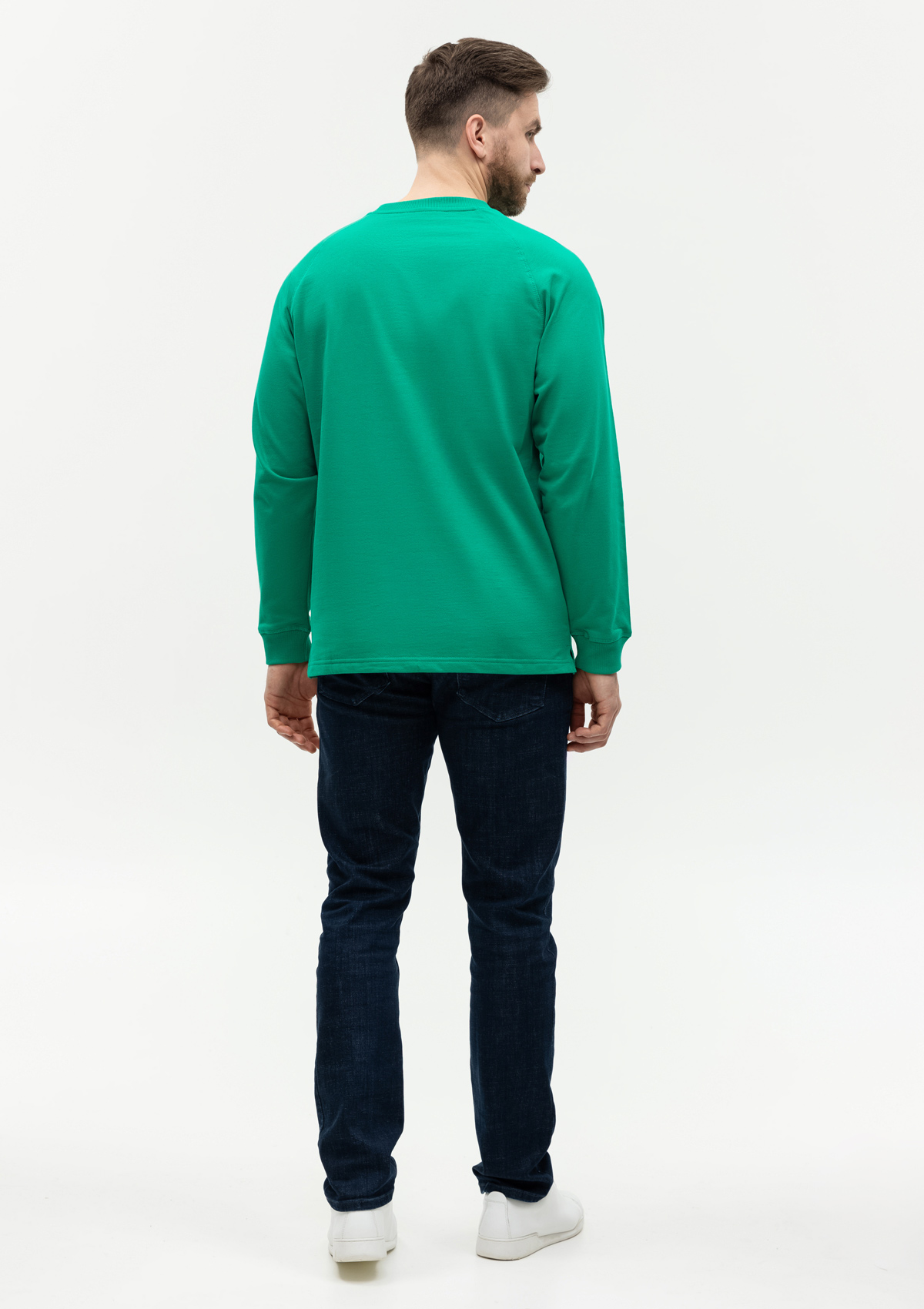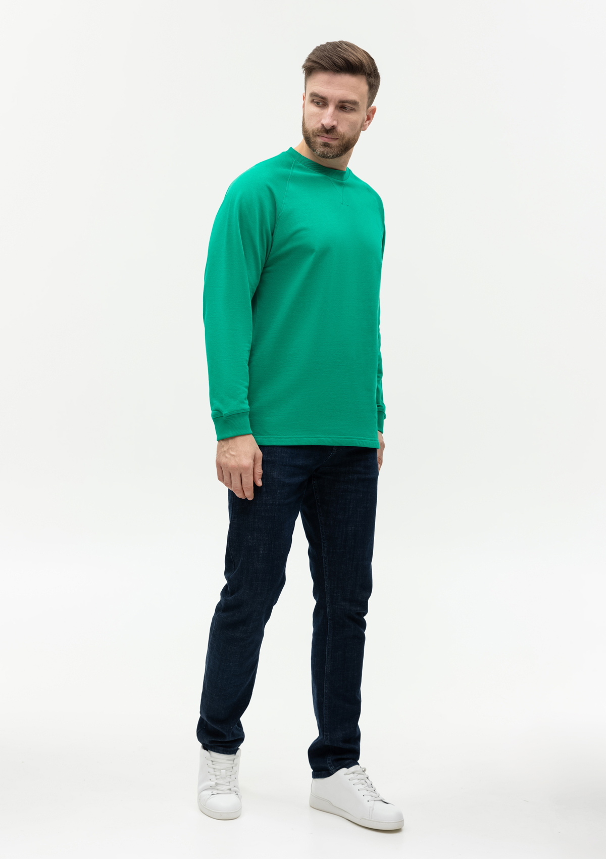 Свободный силуэт, округлый вырез, рукав-реглан и декоративные элементы, отсылающие к классическому крою. Ворот и манжет выполнены широкой эластичной резинкой.