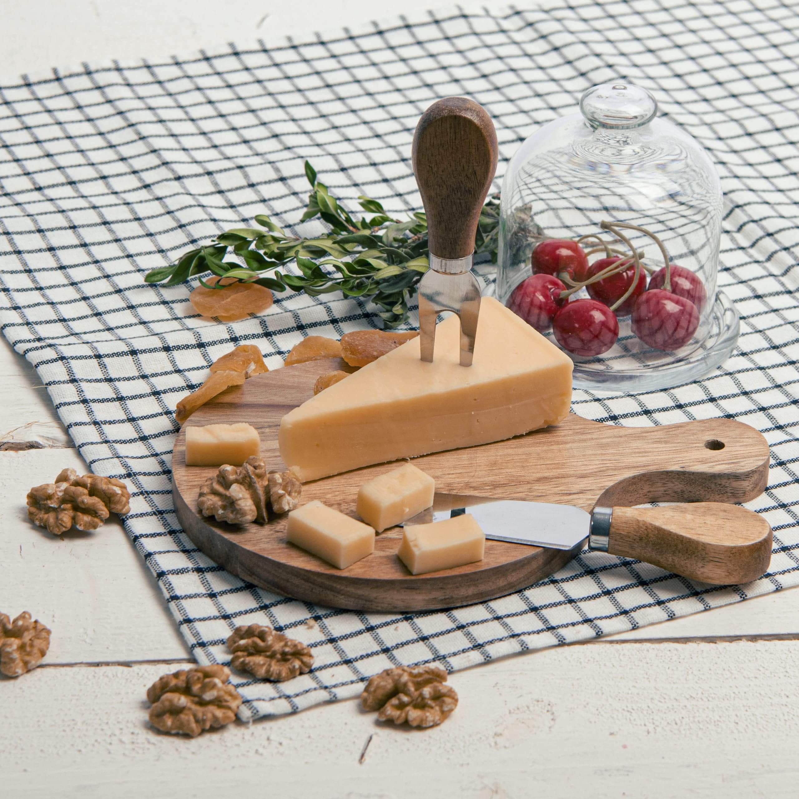 Набор для сыра: круглая доска с ручкой и два инструмента в комплекте - нож для мягкого сыра и вилка.Лезвия ножей выполнены из высококачественной нержавеющей стали.Доска выполнена из экологически чистого и прочного материала — древесины акации. Она обладает высокой твердостью, водоотталкивающими свойствами и не впитывает запахи.Набор для сыра пригодится как для нарезки, так и для сервировки. Индивидуальная упаковка - коробка из крафтового картона с ложементом -