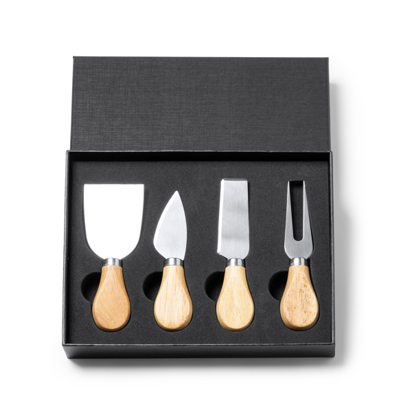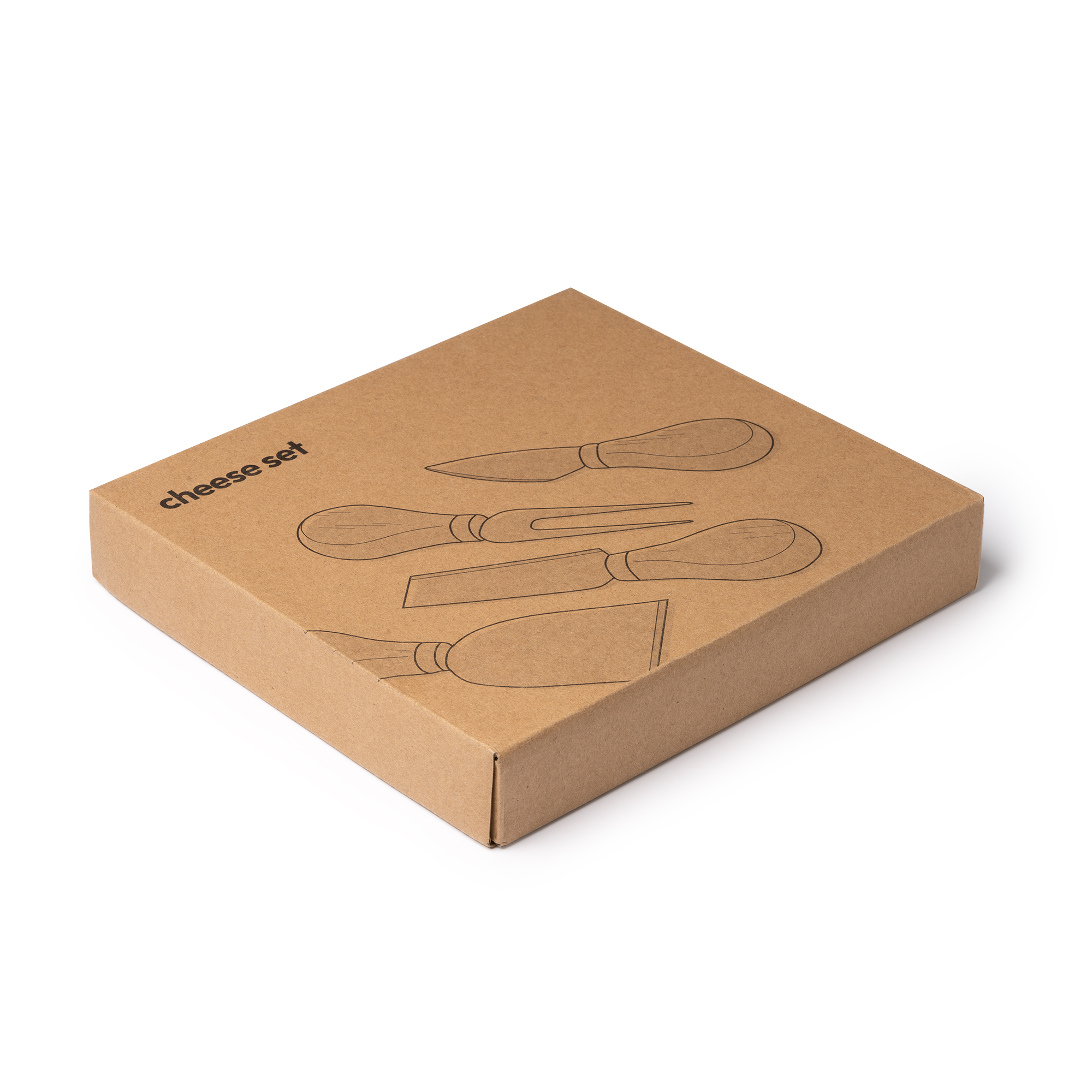 Набор для сыра с 4 приборами из нержавеющей стали с деревянной ручкой. Представлен в крафтовой упаковке.- Виды нанесений: Гравировка CO2-А2, УФ-печать, УФ-Лак, УФ-Цвет+Лак