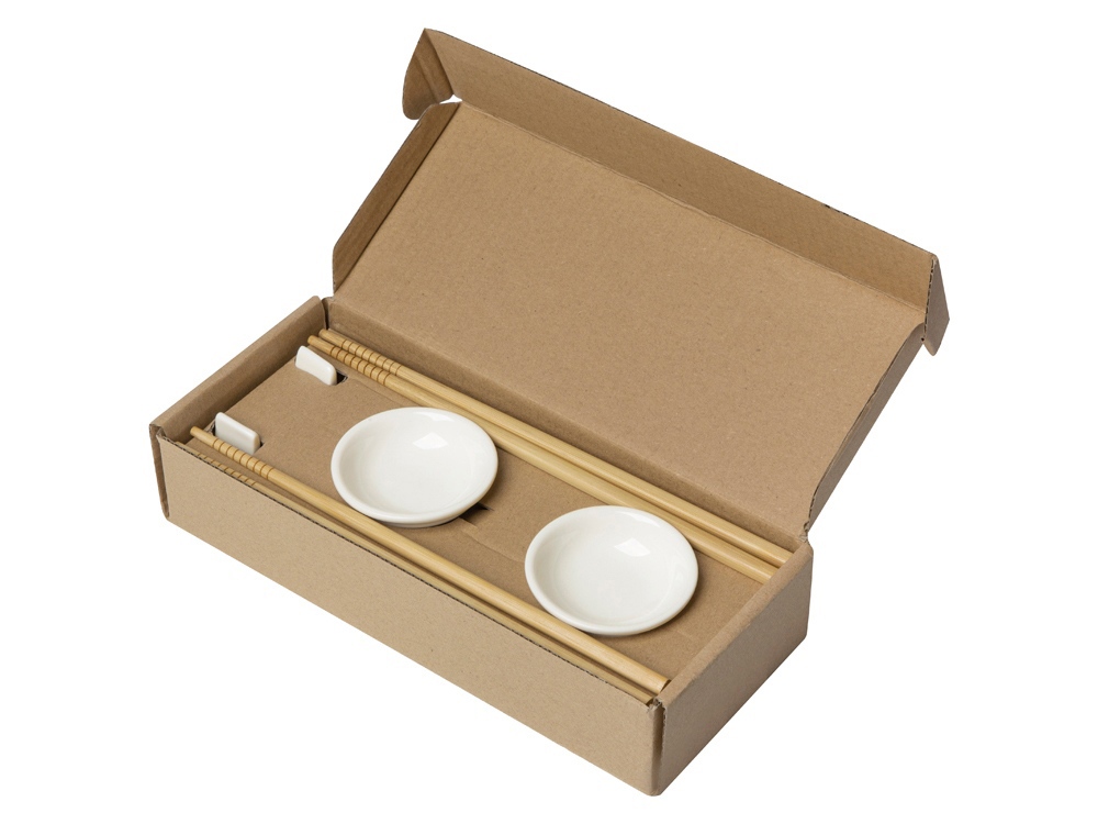 Посуда изготовлена из керамики, а палочки — из бамбука, благодаря чему они не впитывают запахи и не влияют на вкус продуктов.