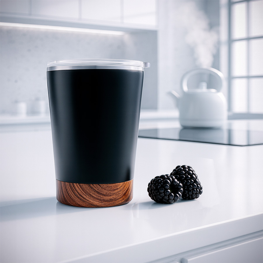 Стильная термокружка с черным матовым корпусом и декоративной вставкой с имитацией фактуры дерева soft-touch. Двойные стенки из стали сохранят напиток горячим до 3х часов. Высота без крышки 11,4 см, подходит для большинства кофемашин. Индвидуальная упаковка - белая картонная коробка -