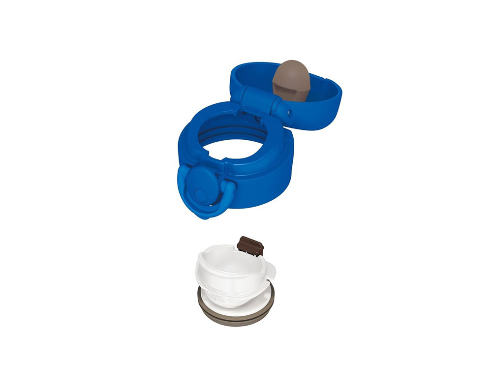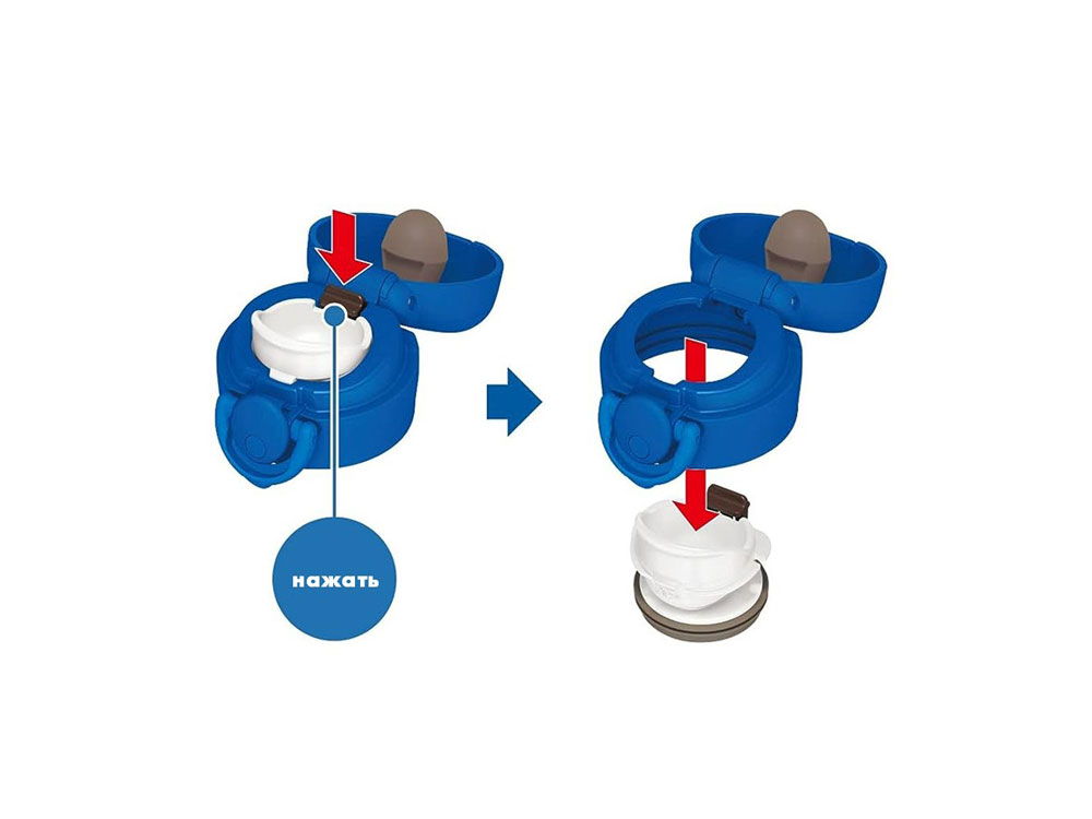 Оригинальная конструкция крышки-пробки позволяет пить из термоса даже на ходу – удобный поильник с небольшим выливным отверстием предотвратит расплёскивание напитка при движении, позволяя контролировать поток жидкости. Термос открывается одной рукой (левой или правой): при нажатии на кнопку верхняя крышка автоматические откидывается на 180 градусов, фиксируется в открытом положении и не опрокидывается при питье.