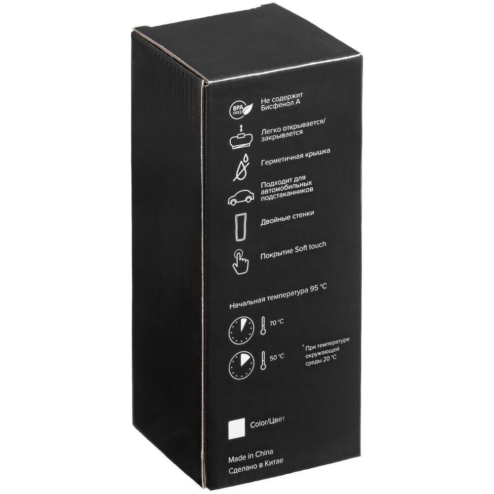 Двухслойная конструкция из нержавеющей стали снаружи и пищевого пластика внутри. Герметичная завинчивающаяся крышка с откидным клапаном для питья. Покрытие софт-тач. В отверстие в крышке можно вставить шнурок для удобного ношения стакана на руке. Шнурок в комплект не входит.