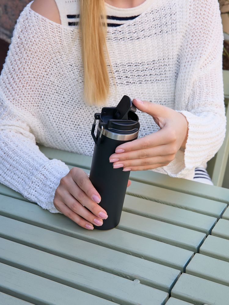 Лаконичный дизайн с ровным цилиндрическим корпусом — специально для круговой печати и гравировки, достаточный объем и привлекательная деталь в виде подвижной квадратной ручки для переноски.Емкость 450 мл.