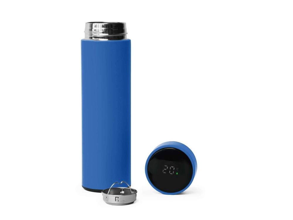 Термос из нержавеющей стали, покрытый цветным soft touch, с крышкой, в которой встроен термометр и LED дисплей, показывающий температуру внутри термоса. Объем: 500 мл. Упаковка: каждый термос в крафт коробке. -