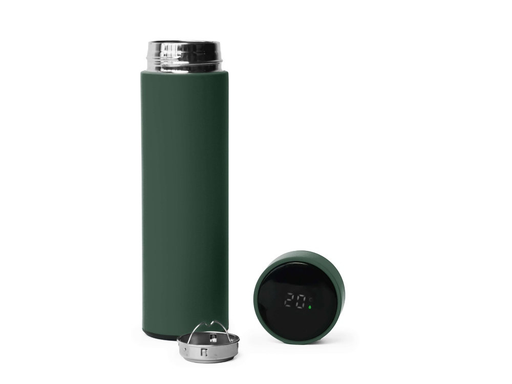 Термос из нержавеющей стали, покрытый цветным soft touch, с крышкой, в которой встроен термометр и LED дисплей, показывающий температуру внутри термоса. Объем: 500 мл. Упаковка: каждый термос в крафт коробке. -