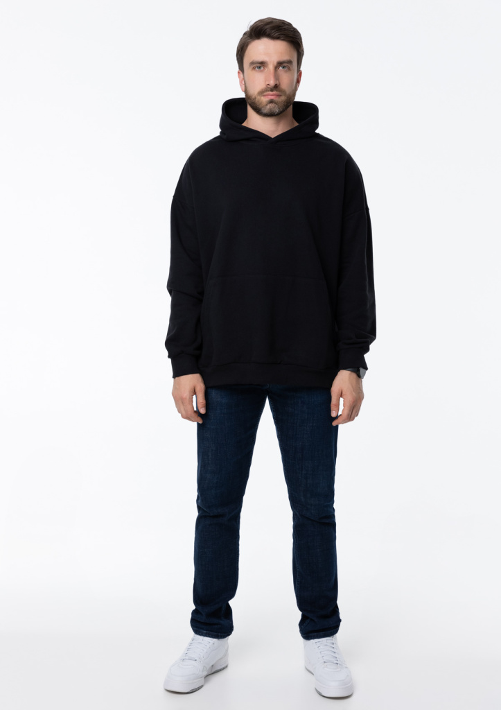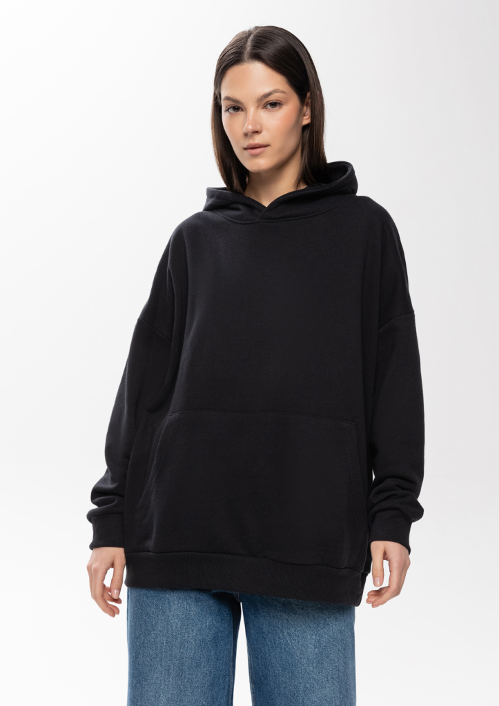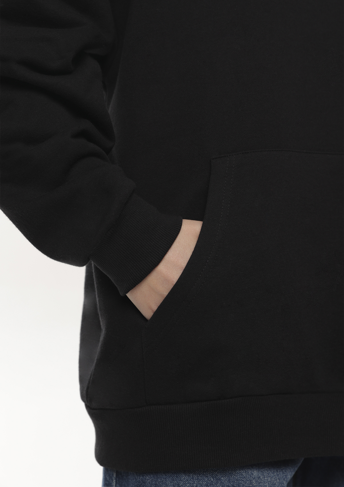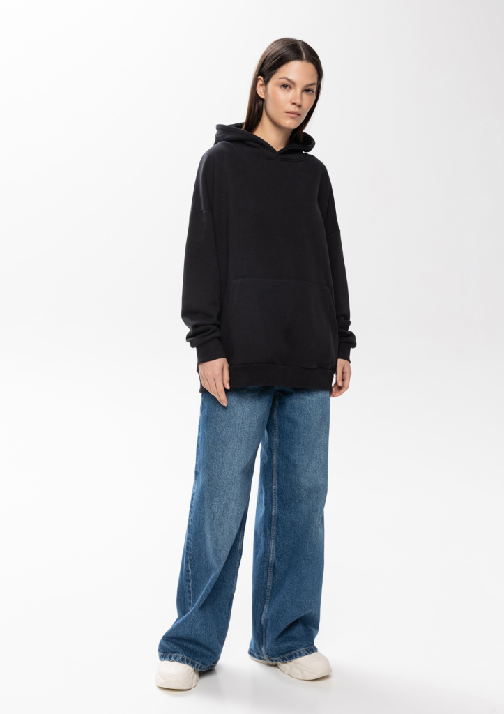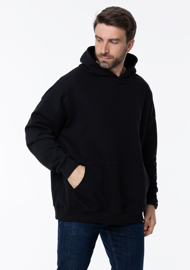 Универсальная толстовка свободного силуэта с капюшоном комфортной глубины, спущенной линией плеча и глубоким карманом-кенгуру. Манжет и низ изделия оформлены широкой эластичной резинкой.