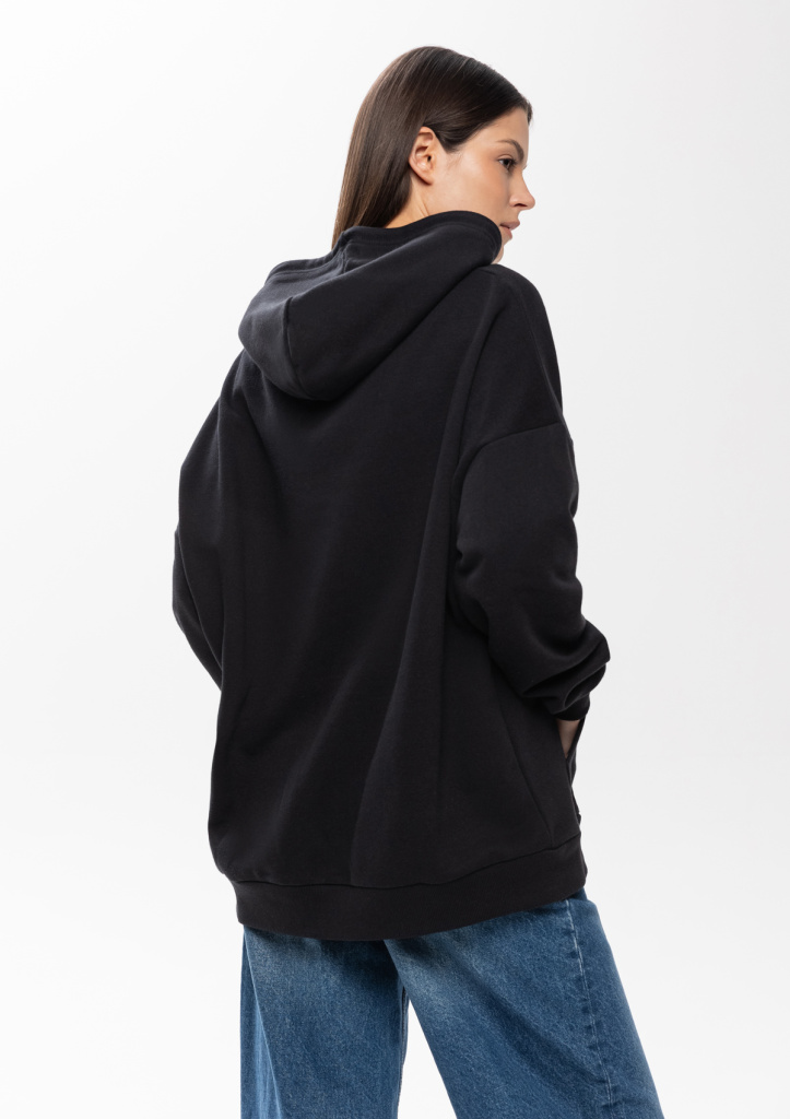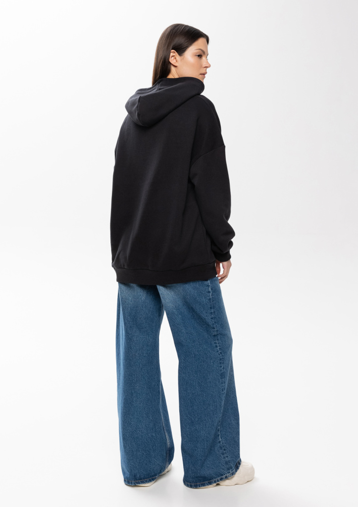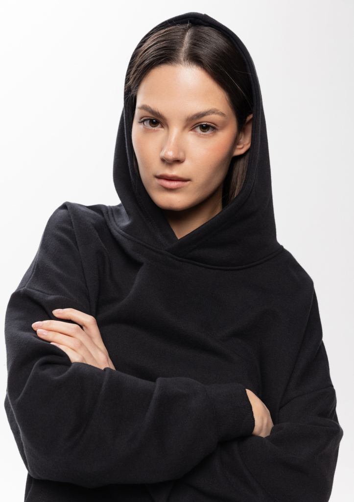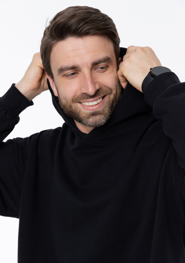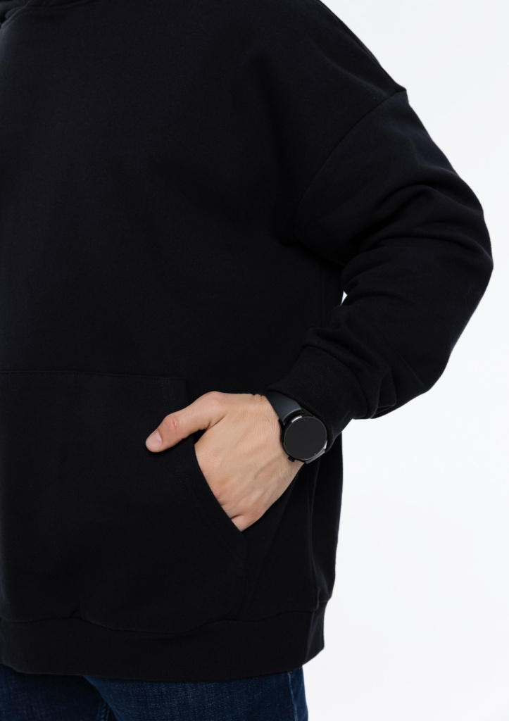 Универсальная толстовка свободного силуэта с капюшоном комфортной глубины, спущенной линией плеча и глубоким карманом-кенгуру. Манжет и низ изделия оформлены широкой эластичной резинкой.