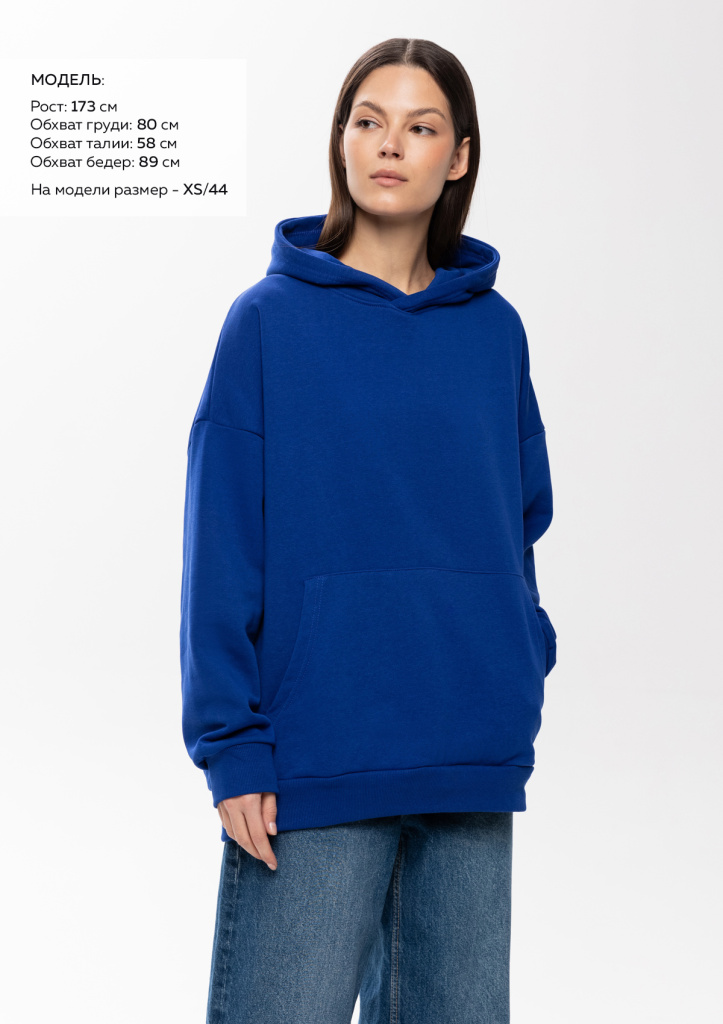 Размер женского худи: XS/44. Параметры модели: рост 173 см.; обхват груди 80 см.; обхват талии 58 см.; обхват бедер 89 см.