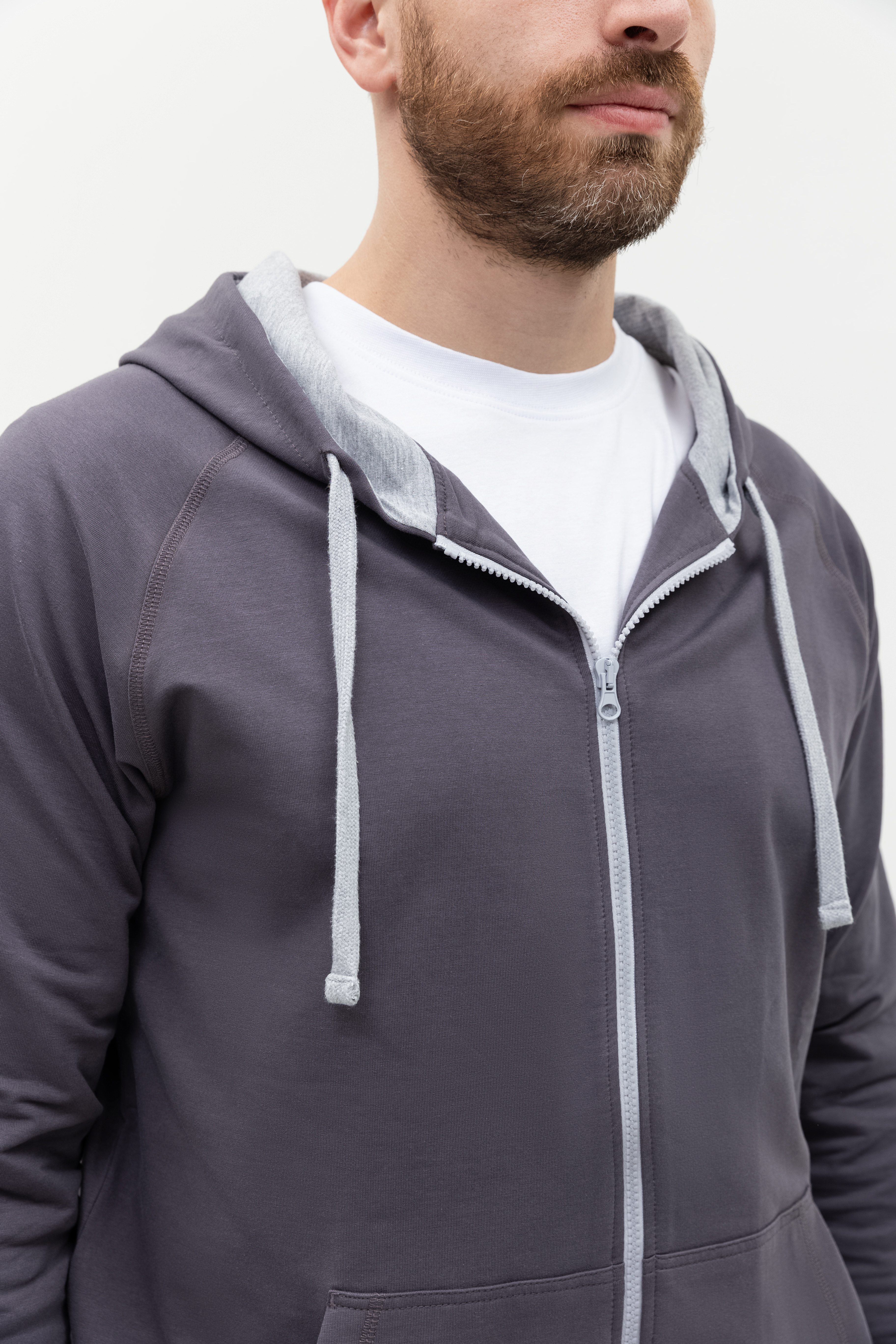 Мужская толстовка прямого силуэта с капюшоном комфортной глубины, рукавом-реглан, глубоким накладным карманом и застежкой на молнию контрастного цвета. Капюшон дополнен шнурком для регулирования прилегания, манжет и низ изделия оформлены широкой эластичной резинкой.