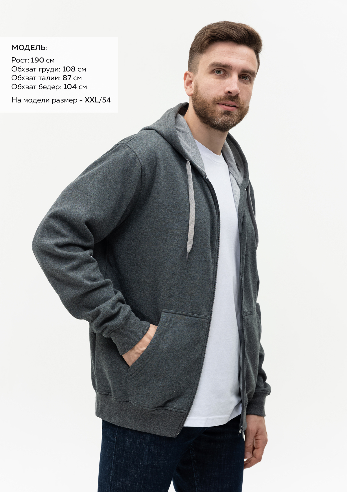 Размер мужской толстовки: XXL/54. Параметры модели: рост 190 см.; обхват груди 108 см.; обхват талии 87 см.; обхват бедер 104 см. -