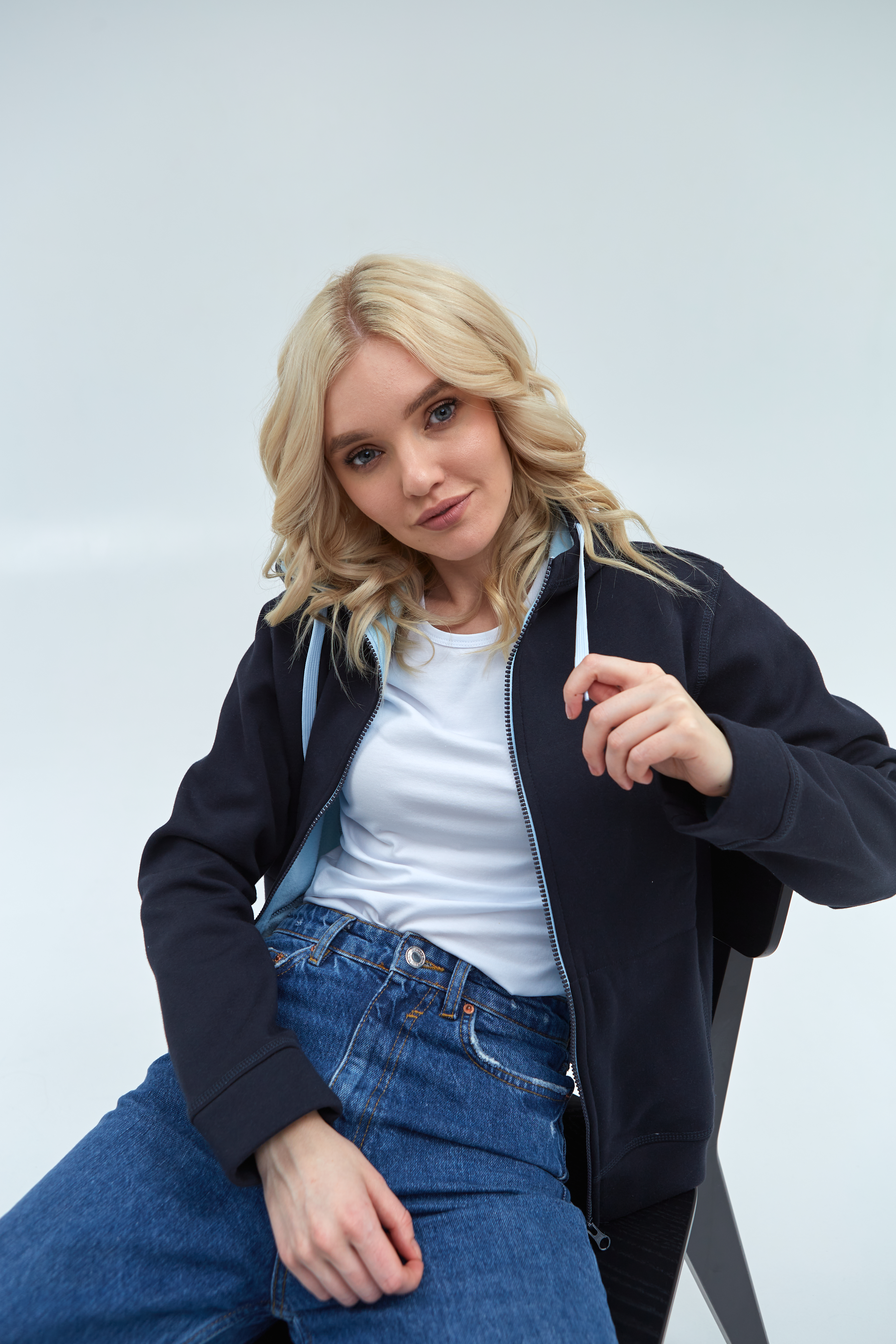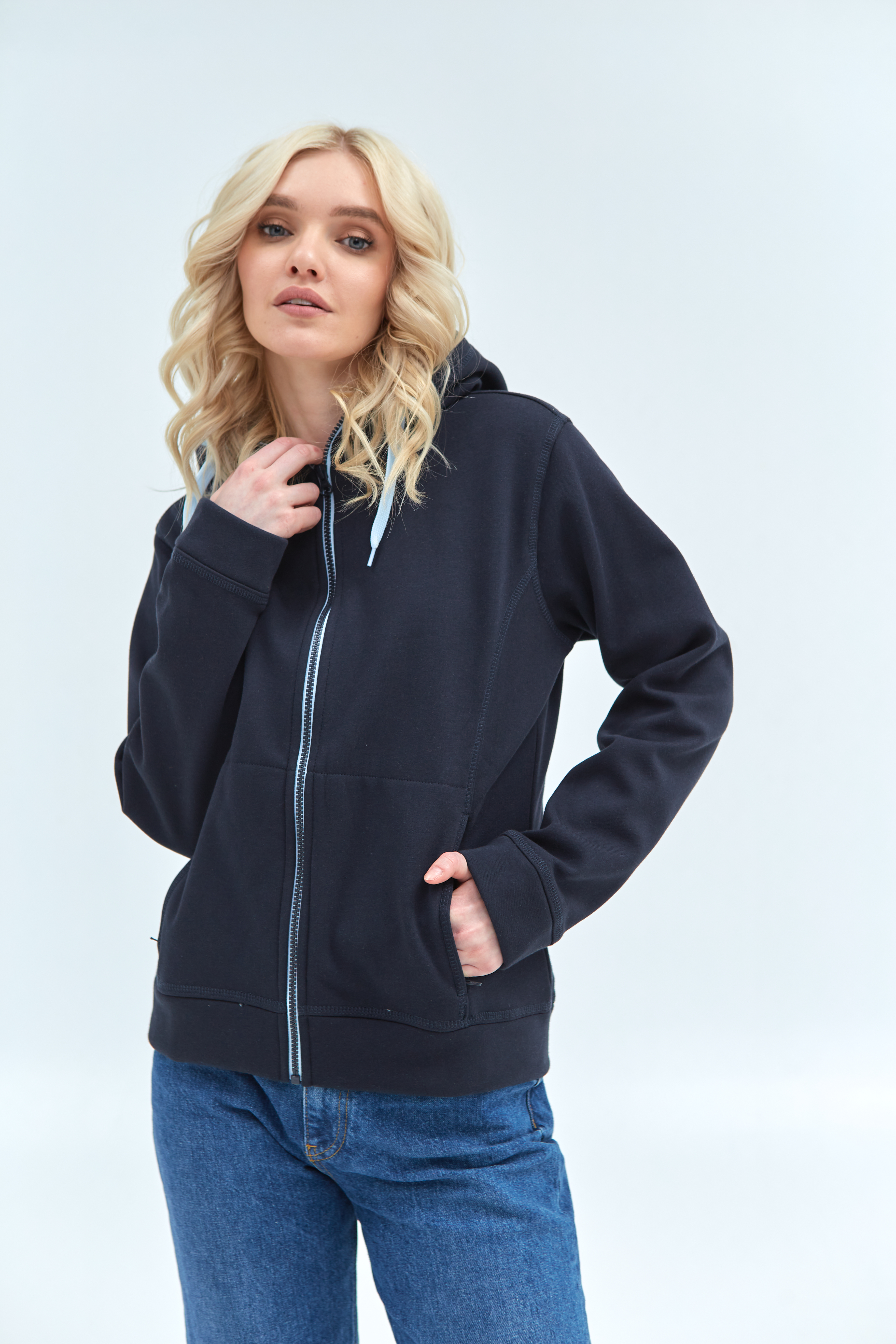 Женская толстовка прямого силуэта с капюшоном комфортной глубины, втачным рукавом, прорезным карманов и застежкой на контрастную молнию. Капюшон дополнен плоским шнурком для регулировки прилегания, манжет и низ изделия выполнены из основного полотна.