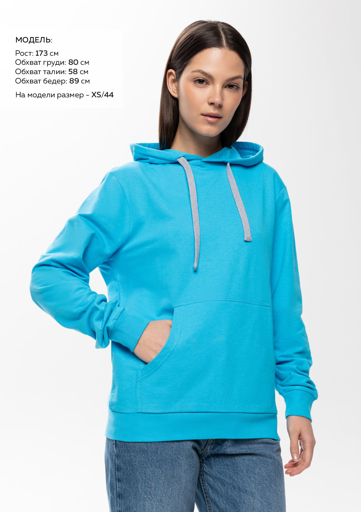 Размер женского худи: XXS/42. Параметры модели: рост 173 см.; обхват груди 80 см.; обхват талии 58 см.; обхват бедер 89 см.