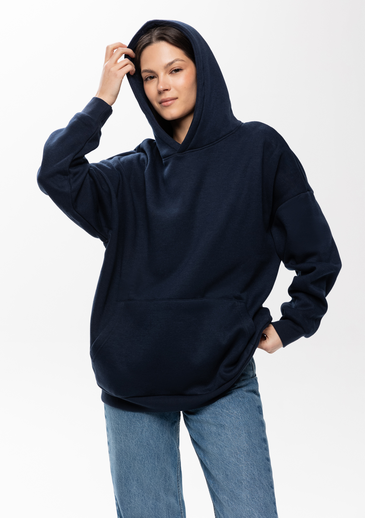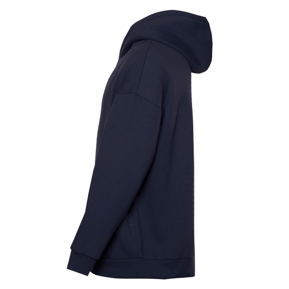 Толстовка свободного силуэта с капюшоном комфортной глубины, спущенной линией плеча и глубоким карманом-кенгуру. Манжет и низ изделия оформлены широкой эластичной резинкой в тон основному цвету.