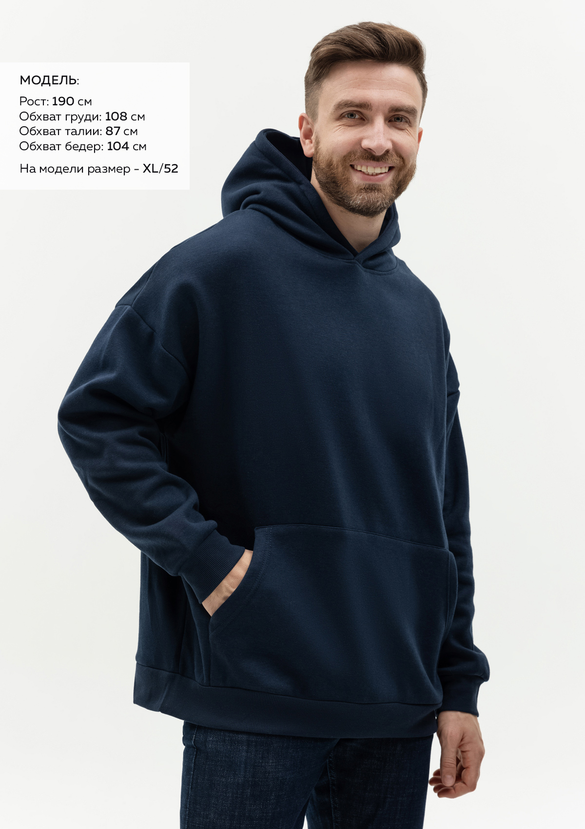 Размер мужского худи: XL/52. Параметры модели: рост 190 см.; обхват груди 108 см.; обхват талии 87 см.; обхват бедер 104 см. -
