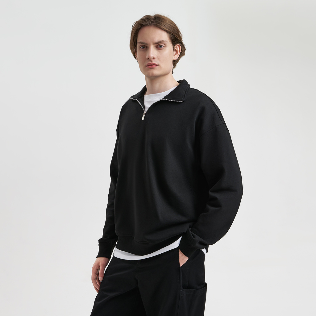 Универсальная толстовка с воротником-стойкой и заниженной линией плеча. По нижнему краю и на рукавах — эластичные резинки для комфортной и аккуратной посадки. Модель застёгивается на металлическую молнию.