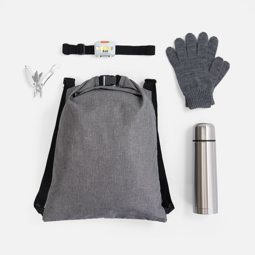 перчатки - шерсть 50%; акрил 50%; мультитул - алюминий, нержавеющая сталь; фонарь - пластик; рюкзак - полиэстер, 300D; термос - нержавеющая сталь, 304 внутри, 201 снаружи; пластик