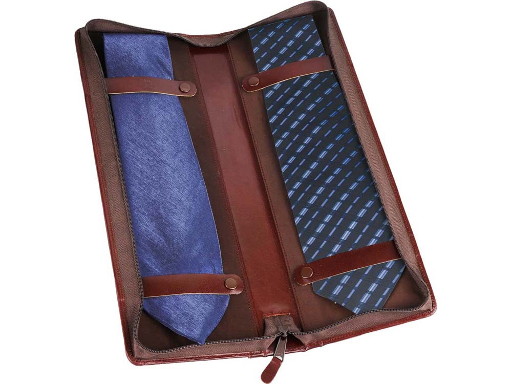 Компактный чехол для хранения галстуков оснащен двумя креплениями. Чехол выполнен из натуральной кожи коричневого оттенка. Благодаря чехлу аккуратно хранить и брать с собой галстуки в командировку стало еще удобнее. -