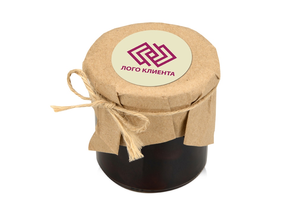 Банка варенья обернута крафт-бумагой, на которую возможно сделать нанесение корпоративного логотипа. -