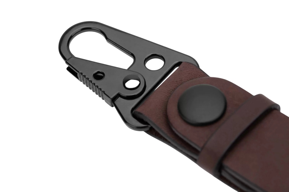 Ремешок сшит из прочной кожи коричневого цвета. Оборудован надёжным металлическим карабином, самопроизвольное расцепление которого невозможно. Ключи, прицепленные к нему, обречены вечно храниться в глубинах сумки или кармана джинсов, и у них нет ни единого шанса потеряться. Прицепить ремешок можно к шлёвке джинсов или к куртке. -