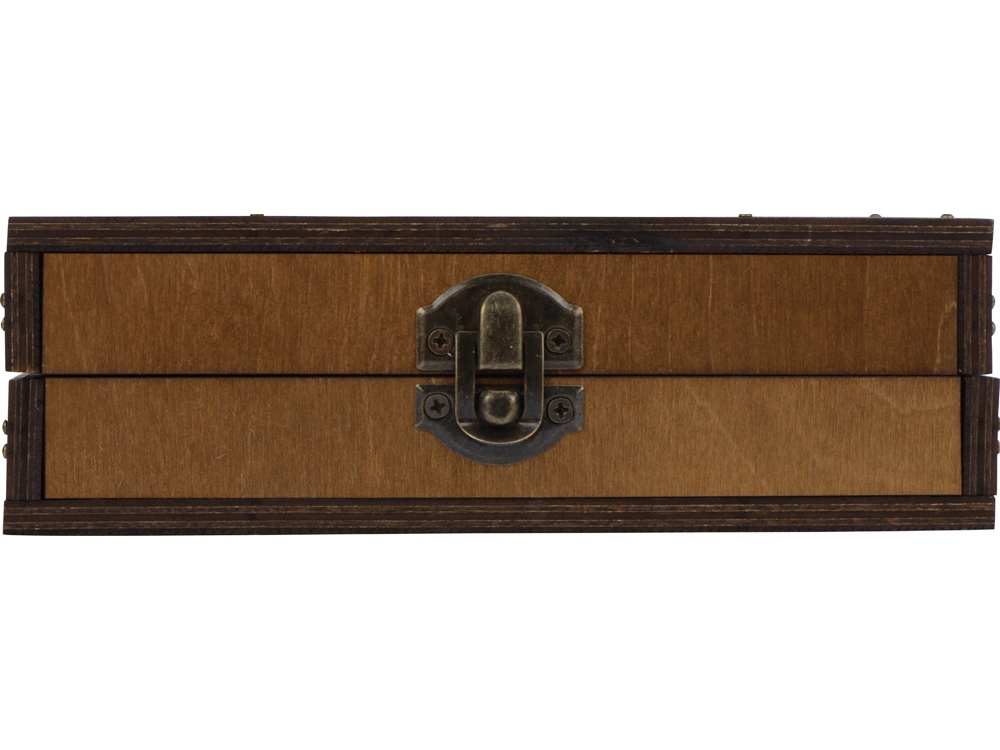 В набор аксессуаров для вина входят штопор-открывалка, воротничок на бутылку, пробка для бутылки и даже термометр. Набор поставляется в презентабельном деревянном футляре. -