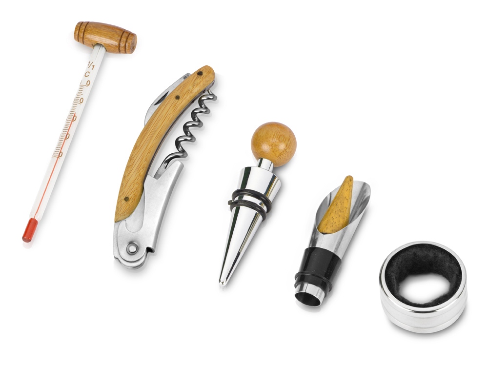 Роскошный набор аксессуаров для вина Кот-де-Сезан – отличный подарок для истинных ценителей. В комплект входят воротничок на бутылку, воронка-аэратор, пробка для бутылки, штопор-открывалка, термометр. Упакованы в красивый деревянный футляр. Отличный вариант имиджевой продукции для ресторанов, гостиниц и винных магазинов. -
