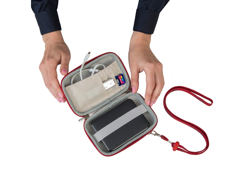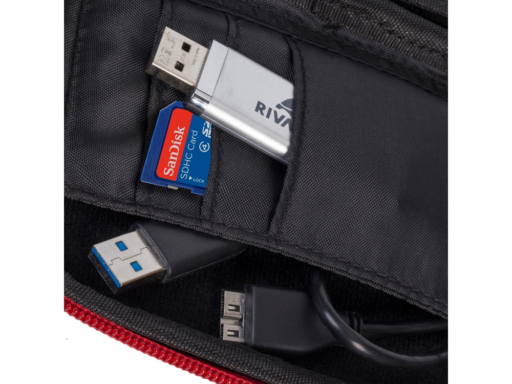 • Устройство надежно крепится внутри чехла специальной фиксирующей лентой, кроме того предусмотрены дополнительные внутренние карманы для кабеля, карт памяти и аксессуаров.