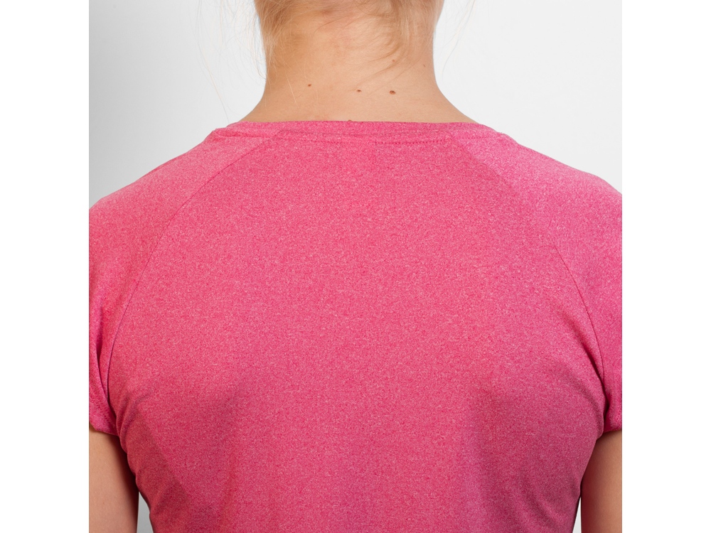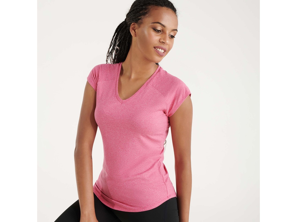 Спортивная женская футболка с коротким рукавом реглан. Вырез горловины V. Полотно из полиэстера на ощупь напоминающее хлопок. Приталенный силуэт. -