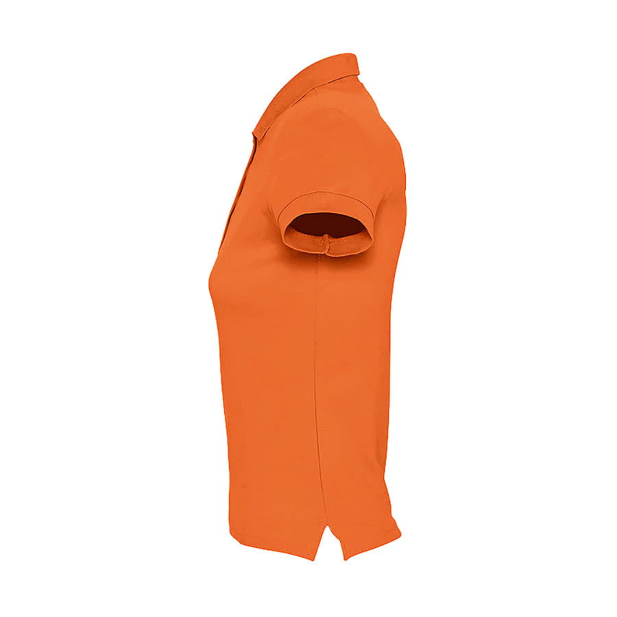 Приталенное женское поло.Прямой низ, боковые разрезы. Рукав короткий.Воротник и манжеты из эластичной резинки-рибаны.Ворот укреплен тесьмой.4 пуговицы в тон изделия на планке.Запасная пуговица на внутреннем боковом шве.Цвет близкий к PANTONE Orange 021C -
