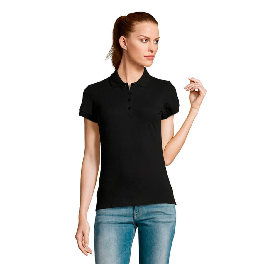 Приталенное женское поло.Прямой низ, боковые разрезы. Рукав короткий.Воротник и манжеты из эластичной резинки-рибаны.Ворот укреплен тесьмой.4 пуговицы в тон изделия на планке.Запасная пуговица на внутреннем боковом шве.Цвет близкий к PANTONE 426C -