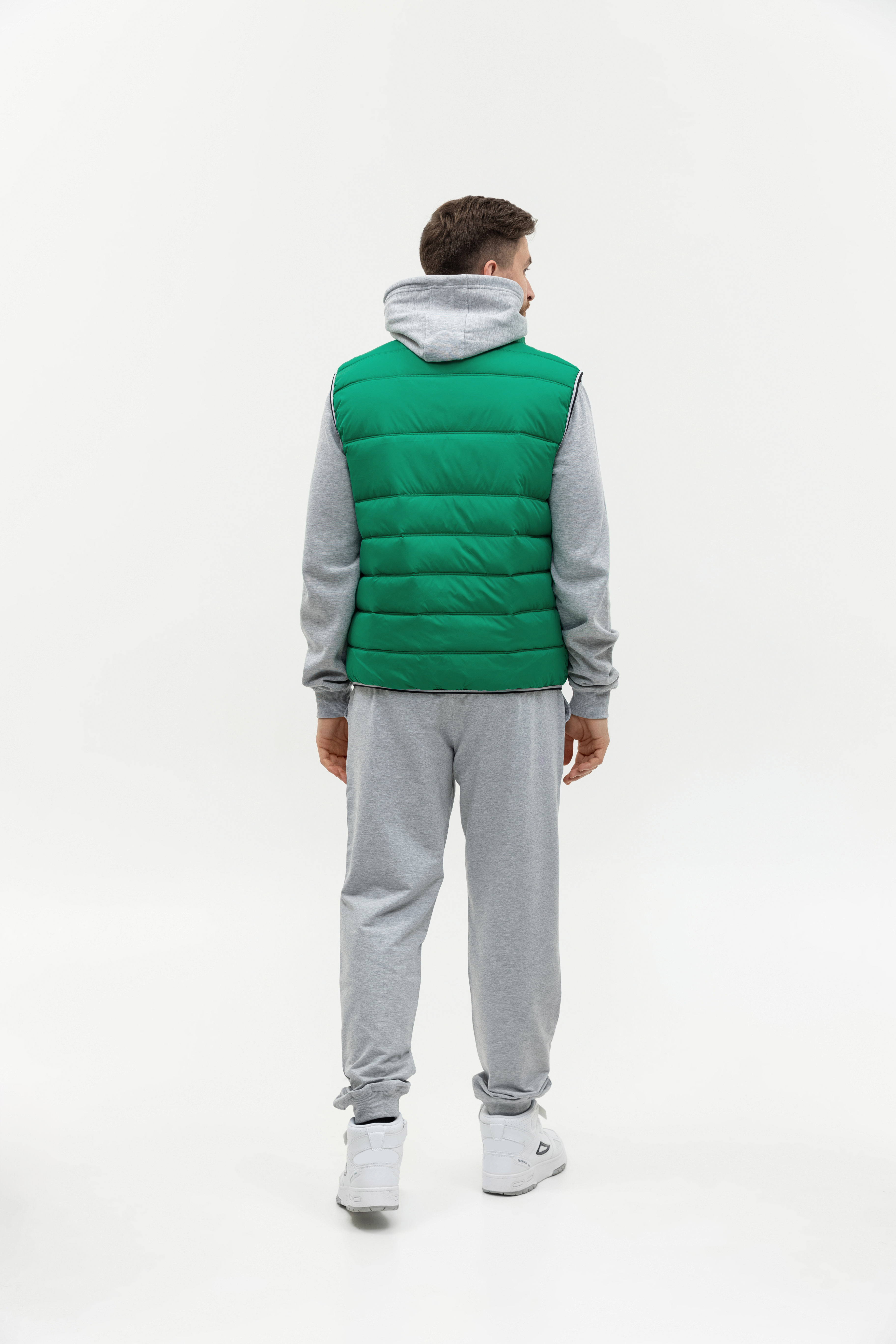 Мужской жилет прямого силуэта с геометричной стежкой, воротником-стойкой, прорезным карманом и застежкой на молнию. Изделие дополнено контрастной резинкой по пройме и линии низа для дополнительной защиты от холода и ветра.