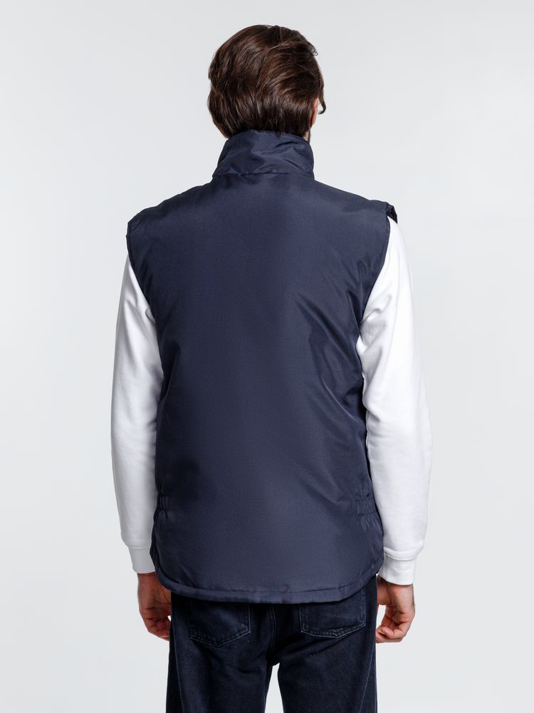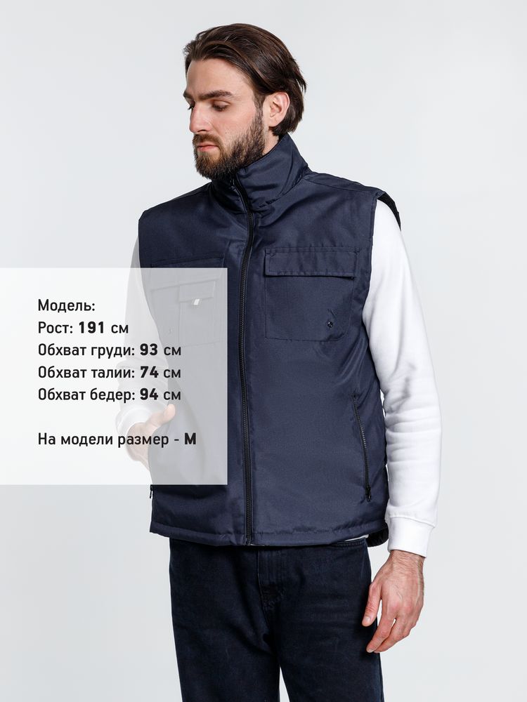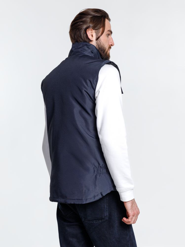 Мужской утепленный жилет с воротником-стойкой и удлиненной спинкой. Выполнен из ткани оксфорд с водоотталкивающим покрытием.- Воротник-стойка на флисовой подкладке