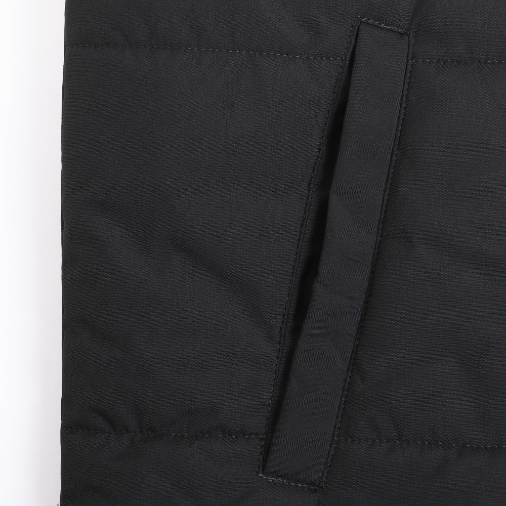 Утеплённый жилет полуприлегающего силуэта с воротником стойкой, центральной застежкой на молнию в тон основному полотну и прорезным карманом с листочкой. Подклад выполнен в цвет основного материала, утеплитель надежно зафиксирован прострочкой по груди и спинке.