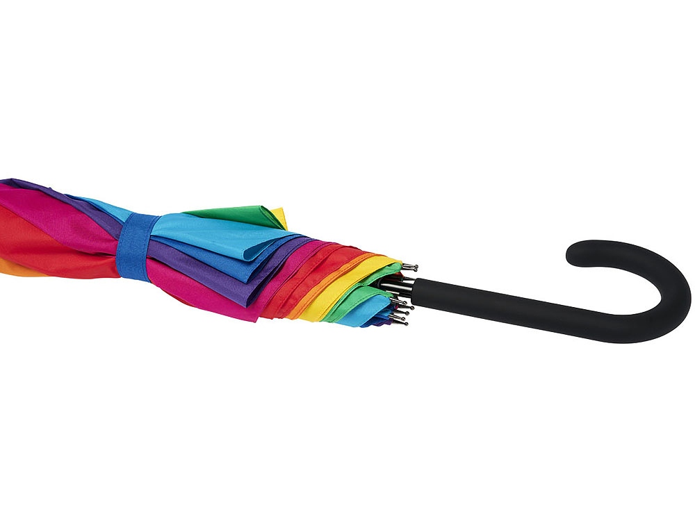 23-дюймовый ветрозащитный полуавтоматический зонт Sarah. Зонт с куполом из эпонж полиэстера, раскрашенный в цвета радуги. Прочный металлический стержень, высококачественная цельная рама из стекловолокна, обеспечивающая максимальную гибкость в ветреную погоду. Выгнутая ручка с мягким матовым покрытием, никелированные верхняя втулка и кончики спиц. Большая область для декорирования на каждой из панелей купола позволяет предложить различные креативные решения для логотипа. Эпонж полиэстер. -