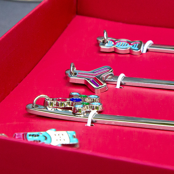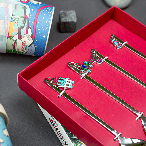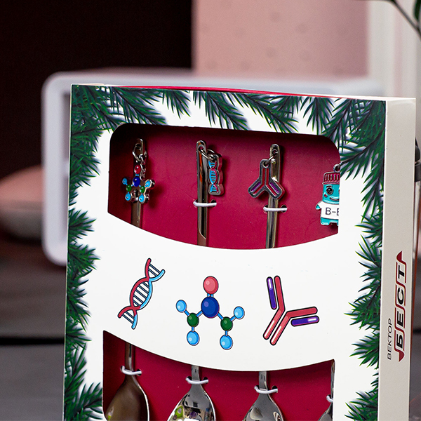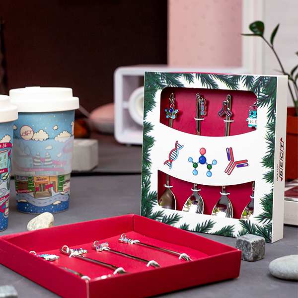 Термокружка и ланчбокс были изготовлены в Китае, с помощью нашего офиса в Гуанчжоу. В подарках всё продумано до мелочей - например, у каждой ложечки индивидуальное навершие, сделанное по технологии изготовления значков с использованием эмали. Каждый элемент символизирует определенный вид деятельности компании.